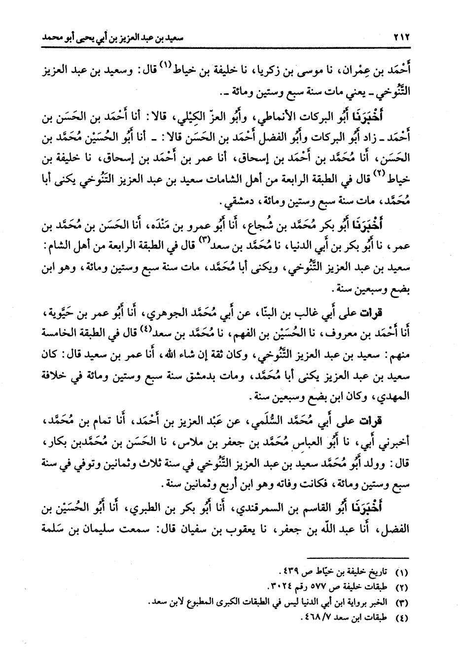 أحمد بن عمران نا موسى بن زكريا نا خليفة بن خياط (1) قال وسعيد بن عبد العزيز التنوخي يعني مات سنة سبع وستين ومائة أخبرنا أبو البركات الأنماطي وأبو العز الكيلي قالا أنا أحمد بن الحسن بن أحمد زاد أبو البركات وأبو الفضل أحمد بن الحسن قالا أنا أبو الحسين محمد بن الحسن أنا محمد بن أحمد بن إسحاق أنا عمر بن أحمد بن إسحاق نا خليفة بن خياط قال في الطبقة الرابعة من أهل الشامات سعيد بن عبد العزيز التنوخي يكنى أبا محمد مات سنة سبع وستين ومائة دمشقي أخبرنا أبو بكر محمد بن شجاع أنا أبو عمرو بن مندة أنا الحسن بن محمد بن عمر نا أبو بكر بن أبي الدنيا نا محمد بن سعد (2) قال في الطبقة الرابعة من أهل الشام سعيد بن عبد العزيز التنوخي ويكنى أبا محمد مات سنة سبع وستين ومائة وهو ابن بضع وسبعين سنة قرأت على أبي غالب بن البنا عن أبي محمد الجوهري أنا أبو عمر بن حيوية أنا أحمد بن معروف نا الحسين بن الفهم نا محمد بن سعد (4) قال في الطبقة الخامسة منهم سعيد بن عبد العزيز التنوخي وكان ثقة إن شاء الله أنا عمر بن سعيد قال كان سعيد بن عبد العزيز يكنى أبا محمد ومات بدمشق سنة سبع وستين ومائة في خلافة المهدي وكان ابن بضع وسبعين سنة قرأت على أبي محمد السلمي عن عبد العزيز بن أحمد أنا تمام بن محمد أخبرني أبي نا أبو العباس محمد بن جعفر بن ملاس نا الحسن بن محمد بن بكار قال وولد أبو محمد سعيد بن عبد العزيز التنوخي في سنة ثلاث وثمانين وتوفي في سنة سبع وستين ومائة فكانت وفاته وهو ابن أربع وثمانين سنة أخبرنا أبو القاسم بن السمرقندي أنا أبو بكر بن الطبري أنا أبو الحسين بن الفضل أنا عبد الله بن جعفر نا يعقوب بن سفيان قال سمعت سليمان بن سلمة