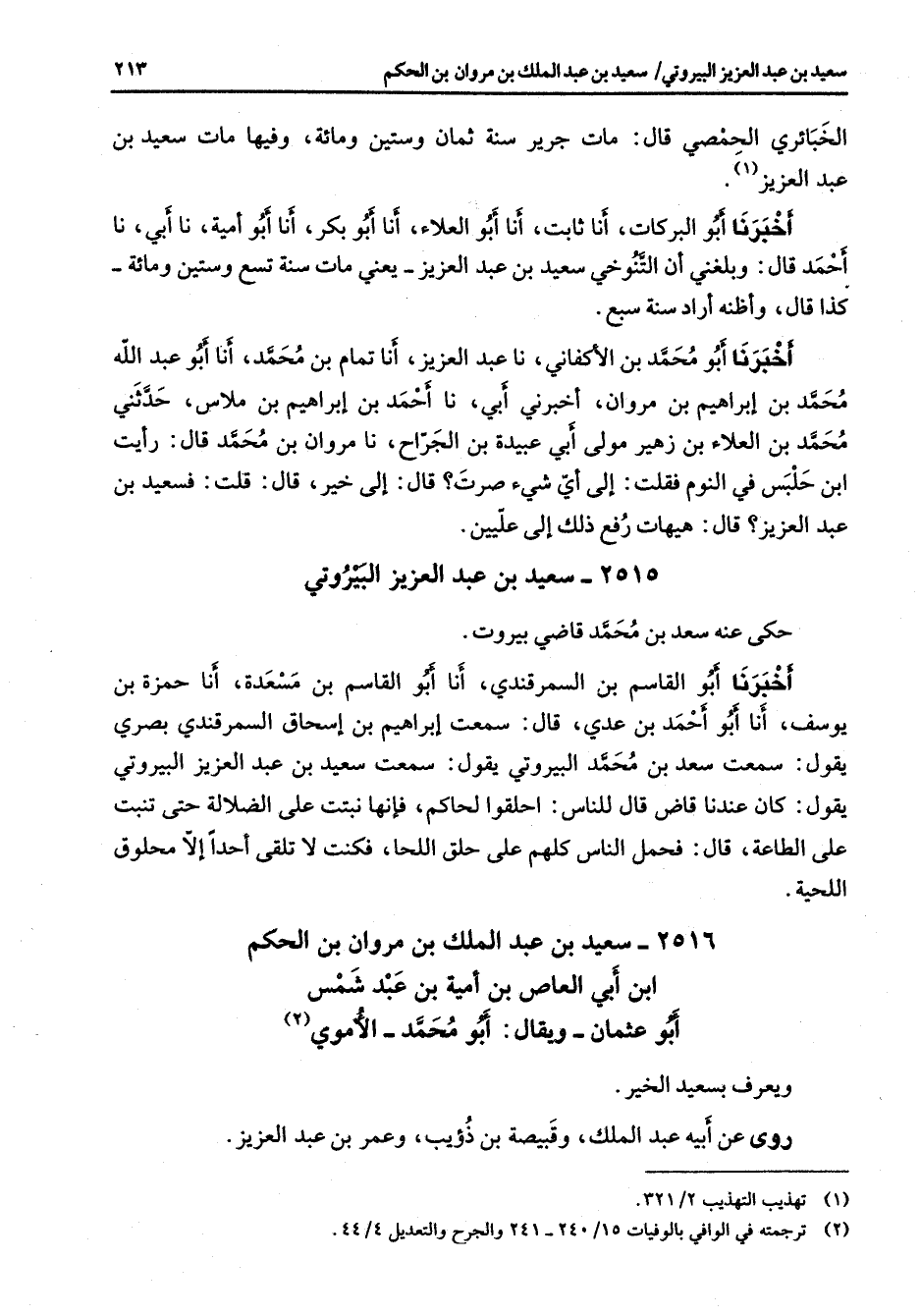 2516 - سعيد بن عبد الملك بن مروان بن الحكم ابن أبي العاص بن أمية بن عبد شمس أبو عثمان ويقال أبو محمد الأموي (2) ويعرف بسعيد الخير روى عن أبيه عبد الملك وقبيصة بن ذؤيب وعمر بن عبد العزيز