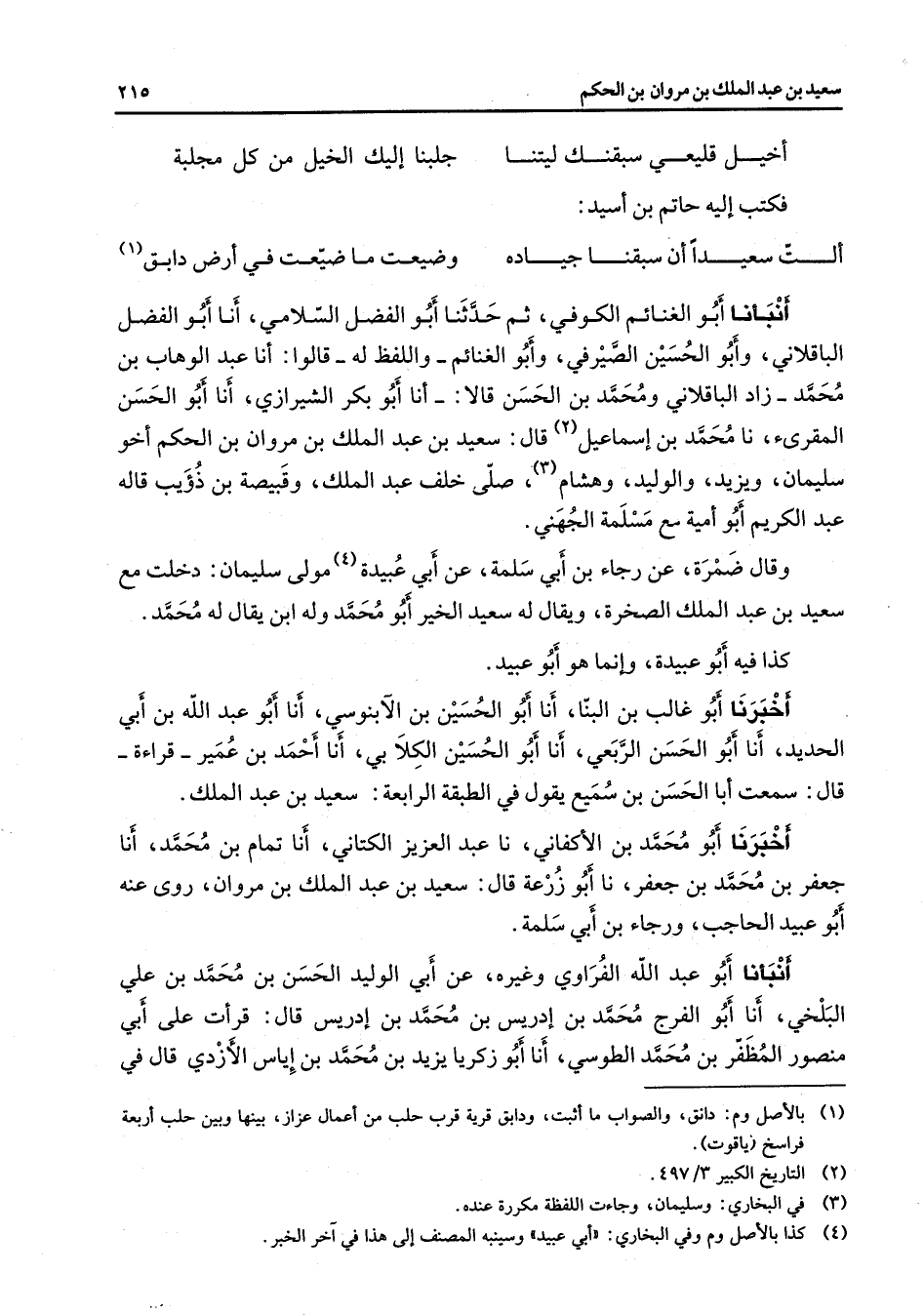 * أخيل قليعي سبقنك ليتنا * جلبنا إليك الخيل من كل مجلبة * فكتب إليه حاتم بن أسيد ألست سعيدا أن سبقنا جياده * وضيعت ما ضيعت في أرض دابق (1) أنبأنا أبو الغنائم الكوفي ثم حدثنا أبو الفضل السلامي أنا أبو الفضل الباقلاني وأبو الحسين الصيرفي وأبو الغنائم واللفظ له قالوا أنا عبد الوهاب بن محمد زاد الباقلاني ومحمد بن الحسن قالا أنا أبو بكر الشيرازي أنا أبو الحسن المقرئ نا محمد بن إسماعيل (2) قال سعيد بن عبد الملك بن مروان بن الحكم أخو سليمان ويزيد والوليد وهشام (3) صلى خلف عبد الملك وقبيصة بن ذؤيب قاله عبد الكريم أبو أمية مع مسلمة الجهني وقال ضمرة عن رجاء بن أبي سلمة عن أبي عبيدة (4) مولى سليمان دخلت مع سعيد بن عبد الملك الصخرة ويقال له سعيد الخير أبو محمد وله ابن يقال له محمد كذا فيه أبو عبيدة وإنما هو أبو عبيد أخبرنا أبو غالب بن البنا أنا أبو الحسين بن الآبنوسي أنا أبو عبد الله بن أبي الحديد أنا أبو الحسن الربعي أنا أبو الحسين الكلابي أنا أحمد بن عمير قراءة قال سمعت أبا الحسن بن سميع يقول في الطبقة الرابعة سعيد بن عبد الملك أخبرنا أبو محمد بن الأكفاني نا عبد العزيز الكتاني أنا تمام بن محمد أنا جعفر بن محمد بن جعفر نا أبو زرعة قال سعيد بن عبد الملك بن مروان روى عنه أبو عبيد الحاجب ورجاء بن أبي سلمة أنبأنا أبو عبد الله الفراوي وغيره عن أبي الوليد الحسن بن محمد بن علي البلخي أنا أبو الفرج محمد بن إدريس بن محمد بن إدريس قال قرأت على أبي منصور المظفر بن محمد الطوسي أنا أبو زكريا يزيد بن محمد بن إياس الأزدي قال في