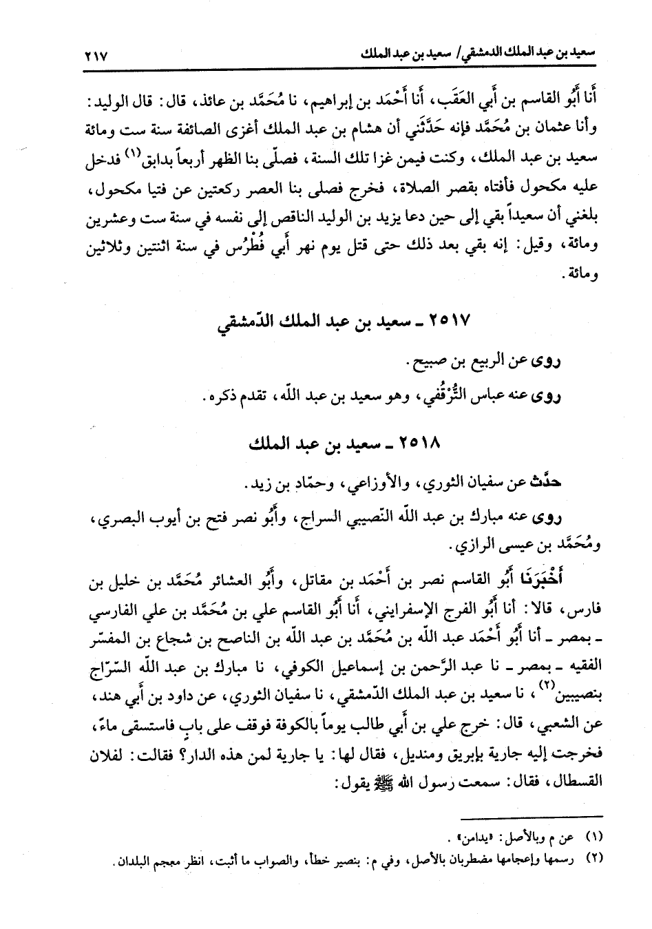 2517 - سعيد بن عبد الملك الدمشقي روى عن الربيع بن صبيح روى عنه عباس الترقفي وهو سعيد بن عبد الله تقدم ذكره 2518 سعيد بن عبد الملك حدث عن سفيان الثوري والأوزاعي وحماد بن زيد روى عنه مبارك بن عبد الله النصيبي السراج وأبو نصر فتح بن أيوب البصري ومحمد بن عيسى الرازي أخبرنا أبو القاسم نصر بن أحمد بن مقاتل وأبو العشائر محمد بن خليل بن فارس قالا أنا أبو الفرج الإسفرايني أنا أبو القاسم علي بن محمد بن علي الفارسي بمصر أنا أبو أحمد عبد الله بن محمد بن عبد الله بن الناصح بن شجاع بن المفسر الفقيه بمصر نا عبد الرحمن بن إسماعيل الكوفي نا مبارك بن عبد الله السراج بنصيبين (2) نا سعيد بن عبد الملك الدمشقي نا سفيان الثوري عن داود بن أبي هند عن الشعبي قال خرج علي بن أبي طالب يوما بالكوفة فوقف على باب فاستسقى ماء فخرجت إليه جارية بإبريق ومنديل فقال لها يا جارية لمن هذا الدار فقالت لفلان القسطال فقال سمعت رسول الله (صلى الله عليه وسلم) يقول