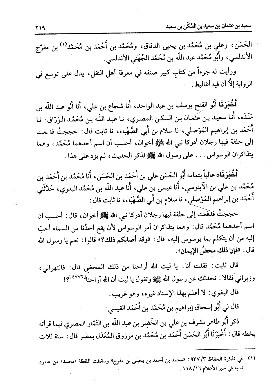 الحسن وعلي بن محمد بن يحيى الدقاق ومحمد بن أحمد بن محمد (1) بن مفرج الأندلسي وأبو محمد عبد الله بن محمد الجهني الأندلسي ورأيت له جزءا من كتاب كبير صنفه في معرفة أهل النقل يدل على توسع في الرواية إلا أن فيه أغاليظ أخبرنا أبو الفتح يوسف بن عبد الواحد أنا شجاع بن علي أنا أبو عبد الله بن مندة أنا سعيد بن عثمان بن السكن المصري نا عبد الله بن محمد الوراق نا أحمد بن إبراهيم الموصلي نا سلام بن أبي الصهباء نا ثابت قال حججت فدفعت إلى حلقة فيها رجلان أدركا نبي الله (صلى الله عليه وسلم) أخوان أحسب أن اسم أحدهما محمد وهما يتذاكران الوسواس على رسول الله (صلى الله عليه وسلم) فذكر الحديث لم يزد على هذا أخبرناه عاليا بتمامه أبو الحسن علي بن أحمد بن الحسن أنا محمد بن أحمد بن محمد بن علي بن الآبنوسي أنا عيسى بن علي أنا عبد الله بن محمد البغوي حدثني أحمد بن إبراهيم الموصلي نا سلام بن أبي الصهباء نا ثابت قال حججت فدفعت إلى حديث حلقة فيها رجلان أدركا نبي الله (صلى الله عليه وسلم) أخوان قال أحسب أن اسم أحدهما محمد قال وهما يتذاكران أمر الوسواس لأن يقع أحدنا من السماء أحب إليه من أن يتكلم بما يوسوس إليه قال وقد أصابكم ذلك قالوا نعم يا رسول الله قال فإن ذلك محض الإيمان قال ثابت فقلت أنا يا ليت الله أراحنا من ذلك المحض قال فانتهراني وزبراني فقالا نحدثك عن رسول الله (صلى الله عليه وسلم) وتقول يا ليت أن الله أراحنا قال البغوي لا أعلم بهذا الإسناد غيره وهو غريب قال لي أبو إسحاق إبراهيم بن محمد بن أحمد القيسي ذكر أبو طاهر مشرف بن علي بن الخضر بن عبد الله بن التمار المصري فيما قرأته بخطه قال أخبرنا أبو الحسن أحمد بن محمد بن مرزوق المعدل بمصر قال سنة ثلاث