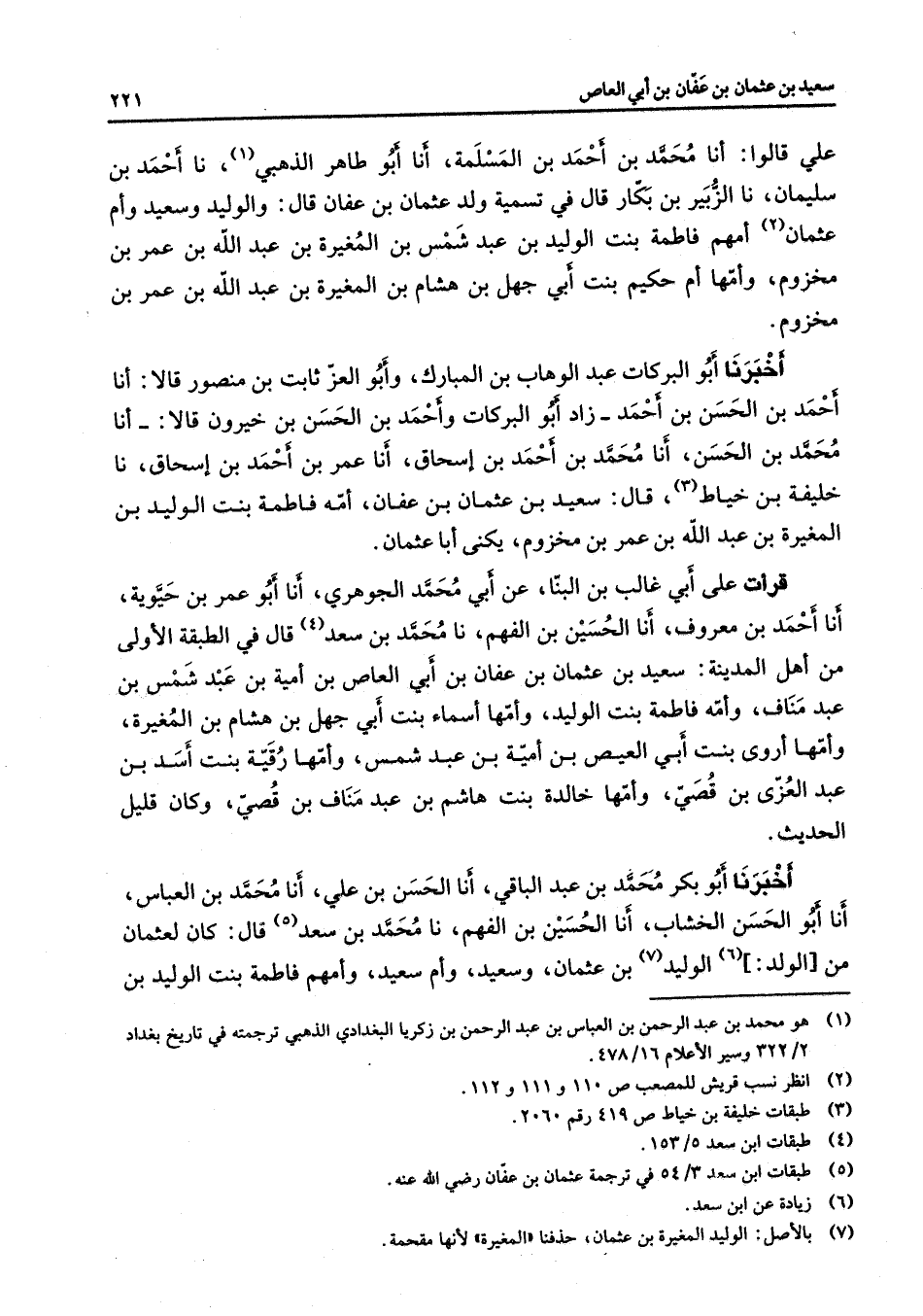 علي قالوا أنا محمد بن أحمد بن المسلمة أنا أبو طاهر الذهبي (1) نا أحمد بن سليمان نا الزبير بن بكار قال في تسمية ولد عثمان بن عفان قال والوليد وسعيد وأم عثمان (2) أمهم فاطمة بنت الوليد بن عبد شمس بن المغيرة بن عبد الله بن عمر بن مخزوم وأمها أم حكيم بنت أبي جهل بن هشام بن المغيرة بن عبد الله بن عمر بن مخزوم أخبرنا أبو البركات عبد الوهاب بن المبارك وأبو العز ثابت بن منصور قالا أنا أحمد بن الحسن بن أحمد زاد أبو البركات وأحمد بن الحسن بن خيرون قالا أنا محمد بن الحسن أنا محمد بن أحمد بن إسحاق أنا عمر بن أحمد بن إسحاق نا خليفة بن خياط (3) قال سعيد بن عثمان بن عفان أمه فاطمة بنت الوليد بن المغيرة بن عبد الله بن عمر بن مخزوم يكنى أبا عثمان قرأت على أبي غالب بن البنا عن أبي محمد الجوهري أنا أبو عمر بن حيوية أنا أحمد بن معروف أنا الحسين بن الفهم نا محمد بن سعد (4) قال في الطبقة الأولى من أهل المدينة سعيد بن عثمان بن عفان بن أبي العاص بن أمية بن عبد شمس بن عبد مناف وأمه فاطمة بنت الوليد وأمها أسماء بنت أبي جهل بن هشام بن المغيرة وأمها أروى بنت أبي العيص بن أمية بن عبد شمس وأمها رقية بنت أسد بن عبد العزى بن قصي وأمها خالدة بنت هاشم بن عبد مناف بن قصي وكان قليل الحديث أخبرنا أبو بكر محمد بن عبد الباقي أنا الحسن بن علي أنا محمد بن العباس أنا أبو الحسن الخشاب أنا الحسين بن الفهم نا محمد بن سعد (5) قال كان لعثمان من الولد (6) الوليد (7) بن عثمان وسعيد وأم سعيد وأمهم فاطمة بنت الوليد بن