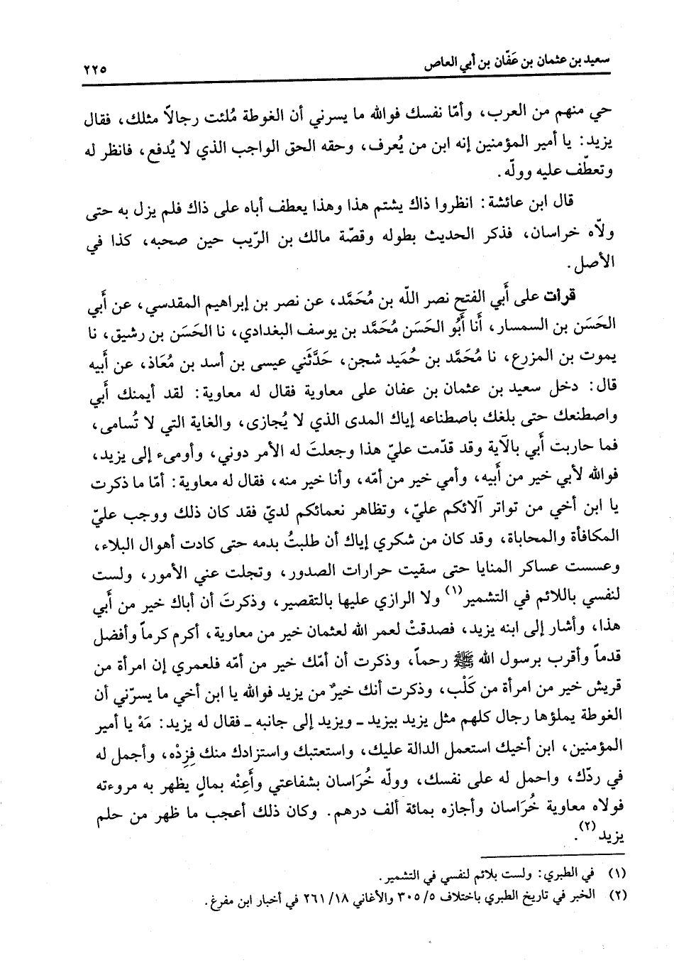 حي منهم من العرب وأما نفسك فوالله ما يسرني أن الغوطة ملئت رجالا مثلك فقال يزيد يا أمير المؤمنين إنه ابن من يعرف وحقه الحق الواجب الذي لا يدفع فانظر له وتعطف عليه ووله قال ابن عائشة انظروا ذاك يشتم هذا وهذا يعطف أباه على ذلك فلم يزل به حتى ولاه خراسان فذكر الحديث بطوله وقصة مالك بن الريب حين صحبه كذا في الأصل قرأت على أبي الفتح نصر الله بن محمد عن نصر بن إبراهيم المقدسي عن أبي الحسن بن السمسار أنا أبو الحسن محمد بن يوسف البغدادي نا الحسن بن رشيق نا يموت بن المزرع نا محمد بن حميد شجن حدثني عيسى بن أسد بن معاذ عن أبيه قال دخل سعيد بن عثمان بن عفان على معاوية فقال له معاوية لقد أيمنك أبي واصطنعك حتى بلغك باصطناعه إياك المدى الذي لا يجازى والغاية التي لا تسامى فما حاربت أبي بالآية وقد قدمت علي هذا وجعلت له الأمر دوني وأومئ إلى يزيد فوالله لأبي خير من أبيه وأمي خير من أمه وأنا خير منه فقال له معاوية أما ما ذكرت يا ابن أخي من تواتر آلائكم علي وتظاهر نعمائكم لدي فقد كان ذلك وو جب علي المكافأة والمحاباة وقد كان من شكري إياك أن طلبت بدمه حتى كادت أهوال البلاء وعسست عساكر المنايا حتى سقيت حرارات الصدور وتجلت عني الأمور ولست لنفسي باللائم في التشمير (1) ولا الرازي عليها بالتقصير وذكرت أن أباك خير من أبي هذا وأشار إلى ابنه يزيد فصدقت لعمر الله لعثمان خير من معاوية أكرم كرم وأفضل قدما وأقرب برسول الله (صلى الله عليه وسلم) رحما وذكرت أن أمك خير من أمه فلعمري إن امرأة من قريش خير من امرأة من كلب وذكرت أنك خير من يزيد فوالله يا ابن أخي ما يسرني أن الغوطة يملؤها رجال كلهم مثل يزيد بيزيد ويزيد إلى جانبه فقال له يزيد مه يا أمير الؤمنين ابن أخيك استعمل الدالة عليك واستعتبك وستزادك منك فزده وأجمل له في ردك واحمل له على نفسك ووله خراسان بشفاعتي وأعنه بمال يظهر به مروءته فولاه معاوية خراسان وأجازه بمائة ألف درهم وكان ذلك أعجب ما ظهر من حلم يزيد (2)