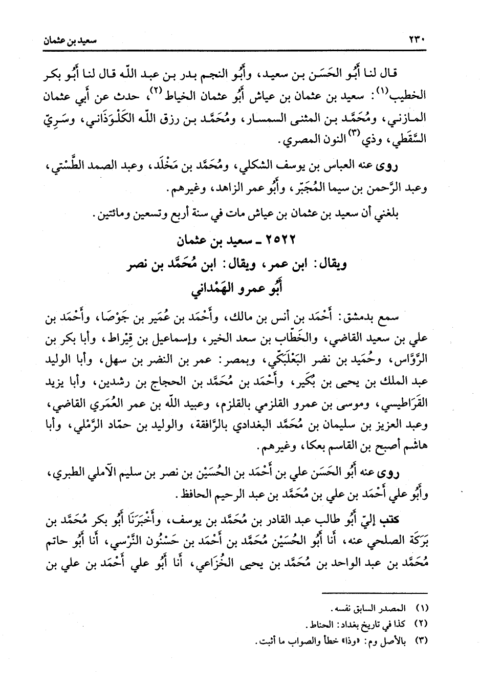2522 - سعيد بن عثمان ويقال ابن عمر ويقال ابن محمد بن نصر أبو عمرو الهمداني سمع بدمشق أحمد بن أنس بن مالك وأحمد بن عمير بن جوصا وأحمد بن علي بن سعيد القاضي والخطاب بن سعد الخير وإسماعيل بن قيراط وأبا بكر بن الرواس وحميد بن نضر البعلبكي وبمصر عمر بن النضر بن سهل وأبو الوليد عبد الملك بن يحيى بن بكير وأحمد بن محمد الحجاج بن رشدين وأبا يزيد القراطيسي وموسى بن عمرو القلزمي بالقلزم وعبيد الله بن عمر العمري القاضي وعبد العزيز بن سليمان بن محمد البغدادي بالرافقة والوليد بن حماد الرملي وأبا هاشم أصبح بن القاسم بعكا وغيرهم روى عنه أبو الحسن علي بن أحمد بن الحسين بن نصر بن سليم الآملي الطبري وأبو علي أحمد بن علي بن محمد بن عبد الرحيم الحافظ كتب إلي أبو طالب عبد القادر بن محمد بن يوسف وأخبرنا أبو بكر محمد بن بركة الصلحي عنه أنا أبو الحسين محمد بن أحمد بن حسنون النرسي أنا أبو حاتم محمد بن عبد الواحد بن محمد بن يحيى الخزاعي أنا أبو علي أحمد بن علي بن
