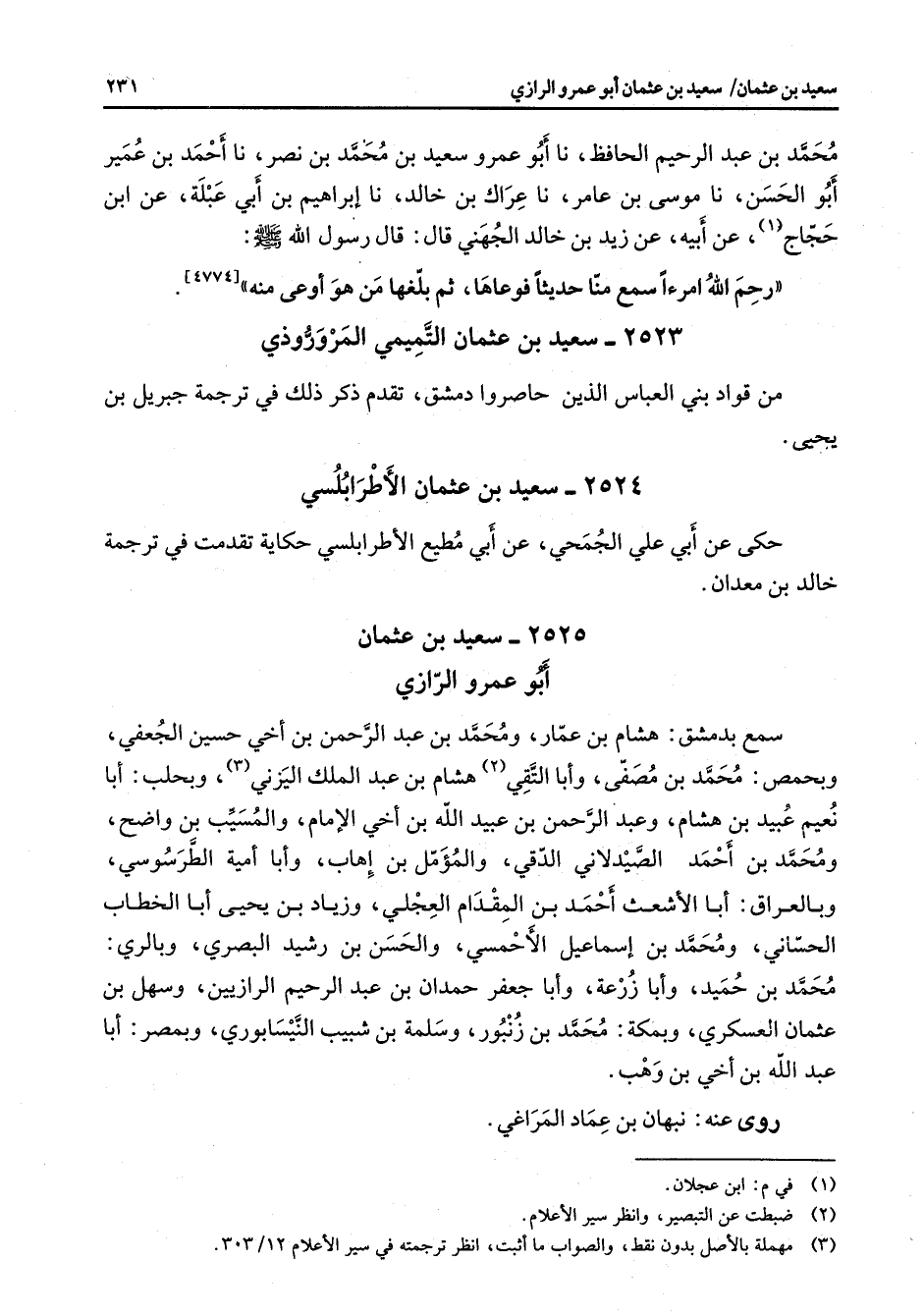2525 - سعيد بن عثمان أبو عمرو الرازي سمع بدمشق هشام بن عمار ومحمد بن عبد الرحمن بن أخي حسين الجعفي وبحمص محمد بن مصفى وأبا التقي (2) هشام بن عبد الملك اليزني (3) وبحلب أبا نعيم عبيد بن هشام وعبد الرحمن بن عبيد الله بن أخي الإمام والمسيب بن واضح ومحمد بن أحمد الصيدلاني الدقي والمؤمل بن إهاب وأبا أمية الطرسوسي وبالعراق أبا الأشعث أحمد بن المقدام العجلي وزياد بن يحيى أبا الخطاب الحساني ومحمد بن إسماعيل الأحمسي والحسن بن رشيد البصري وبالري محمد بن حميد وأبا زرعة وأبا جعفر بن عبد الرحيم الرازيين وسهل بن عثمان العسكري وبمكة محمد بن زنبور وسلمة بن شبيب النيسابوري وبمصر أبا عبد الله بن أخي بن وهب روى عنه نبهان بن عماد المراغي