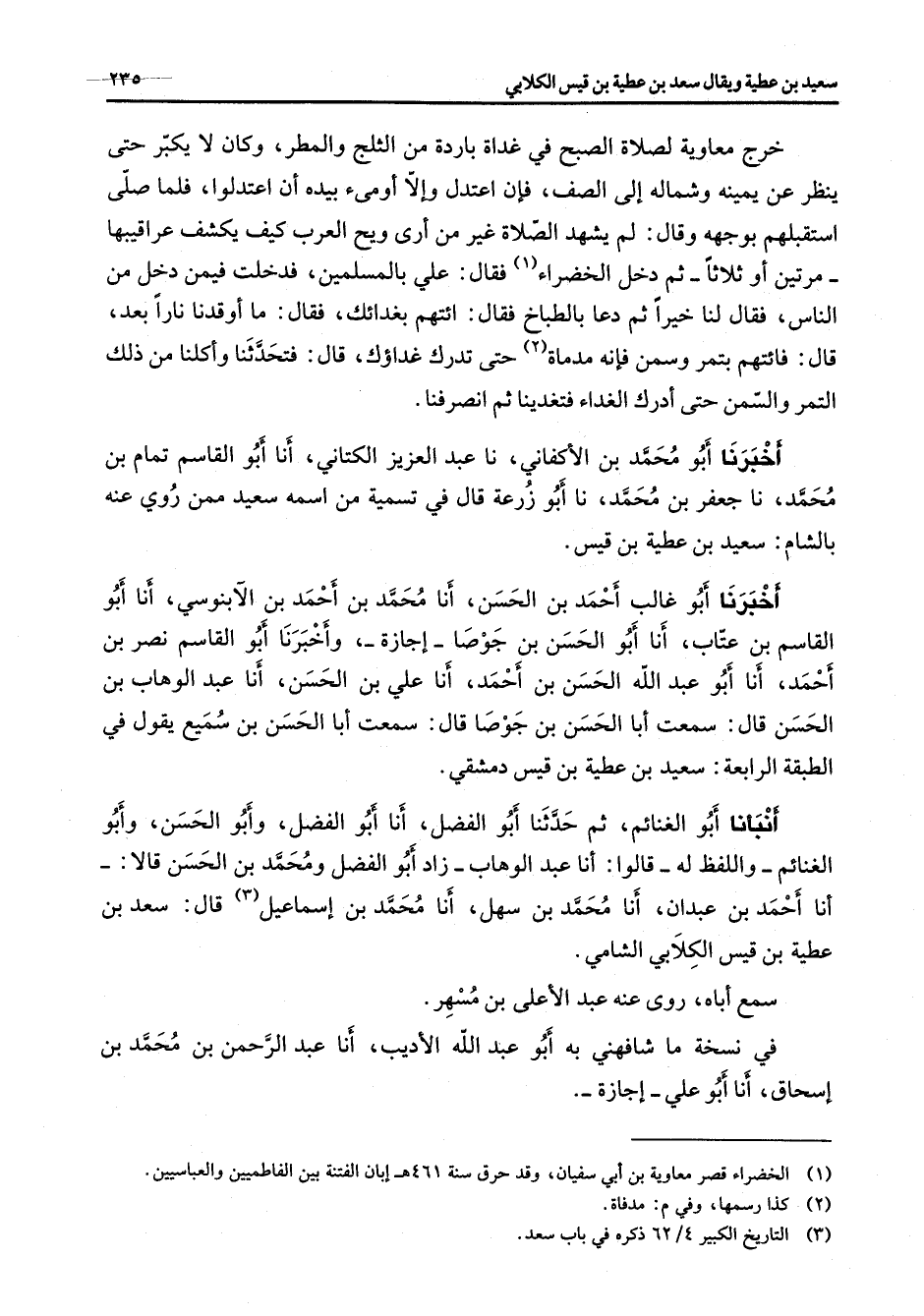 خرج معاوية لصلاة الصبح في غداة باردة من الثلج والمطر وكان لا يكبر حتى ينظر عن يمينه وشماله إلى الصف فإن اعتدل وإلا أومئ بيده أن اعتدلوا فلما صلى استقبلهم بوجهه وقال لم يشهد الصلاة غير من أرى ويح العرب كيف يكشف عراقيبها مرتين أو ثلاثا ثم دخل الخضراء (1) فقال علي بالمسلمين فدخلت فيمن دخل من الناس فقال لنا خيرا ثم دعا بالطباخ فقال ائتهم بغدائك فقال ما أوقدنا نارا بعد قال فائتهم بتمر وسمن فإنه مدماة (2) حتى تدرك غداؤك قال فتحدثنا وأكلنا من ذلك التمر والسمن حتى أدرك الغداء فتغدينا ثم انصرفنا أخبرنا أبو محمد بن الأكفاني نا عبد العزيز الكتاني أنا أبو القاسم تمام بن محمد نا جعفر بن محمد نا أبو زرعة قال في تسمية من اسمه سعيد ممن روى عنه بالشام سعيد بن عطية بن قيس أخبرنا أبو غالب أحمد بن الحسن أنا محمد بن أحمد بن الآبنوسي أنا أبو القاسم بن عتاب أنا أبو الحسن بن جوصا إجازة وأخبرنا أبو القاسم نصر بن أحمد أنا أبو عبد الله الحسن بن أحمد أنا علي بن الحسن أنا عبد الوهاب بن الحسن قال سمعت أبا الحسن بن جوصا قال سمعت أبا الحسن بن سميع يقول في الطبقة الرابعة سعيد بن عطية بن قيس دمشقي أنبأنا أبو الغنائم ثم حدثنا أبو الفضل أنا أبو الفضل وأبو الحسن وأبو الغنائم واللفظ له قالوا أنا عبد الوهاب زاد أبو الفضل ومحمد بن الحسن قالا أنا أحمد بن عبدان أنا محمد بن سهل أنا محمد بن إسماعيل (3) قال سعد بن عطية بن قيس الكلابي الشامي سمع أباه روى عنه عبد الأعلى بن مسهر في نسخة ما شافهني به أبو عبد الله الأديب أنا عبد الرحمن بن محمد بن إسحاق أنا أبو علي إجازة