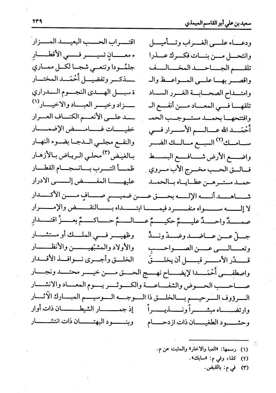ودعاء على الغراب وتاميل * اقتراب الحب البعيد المزار وانتحل من بنات فكرك عذرا * ء معان تسير في الأقطار تلقم الجاحد المخالف * جلمودا وتنعي شجا لكل مماري واقصر بها على المواعظ وال * ذكر وتفضيل أحمد المختار وامتداح الصحابة الغرر الساد * ة سبل الهدى النجوم الدراري تلقها في المعاد من أنفع ال * زاد وخير العباد والاخيار (1) وافتتحها بحمد مستوجب الحم * د على الأنعم الكناف العرار أحمد الله عالم الأسرار في * خفيات غامض الإضمار سامك (2) السبع مالك الضر * والنفع مجلي الدجا بضوء النهار واضع الأرض شافع البسط * بالغيض (3) محلي الرياض بالأزهار فالق الحب مخرج الأب مروي * ظمأ الترب بانسجام القطار حمد مسترهن عطاياه بالحمد * عليها المفض إلى الادرار شاهد أنه الإله بحق عن ضمير * صاف من الأكدار لا إله سواه منفرد فيما * ابتداه بالنقض والإمرار صمد واحد عليم حكيم عالم * حاكم بعز اقتدار * * جل عن عاضد وضد وند * وظهير في الملك أو مستشار وتعالى عن الصواحب و * الأولاد والمشبهين والأنظار قدر الأمر قبل أن يخلق * الخلق وأجرى نوافذ الأقدار واصطفى أحمدا لإيضاح نهج * الحق من خير محتد ونجار صاحب الحوض والشفاعة و * الكوثر يوم المعاد والانشار الرؤوف الرحيم بالخلق ذا * الوجه الوسيم المبارك الآثار وارتضاه مبشرا ونذيرا * إذ جمار الشيطان ذات أوار وحشود الطغيان ذات ازدحام * وبنود البهتان ذات انتشار