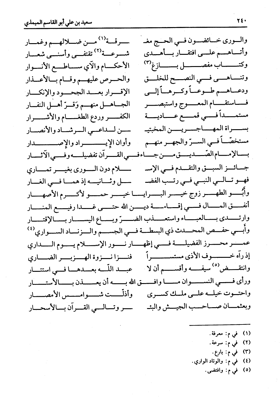 * * والورى خائضون في الحج مغ * رقة (1) من ضلالهم وغمار وأتاهم على افتقار بأهدى * شرعة (2) تقتفى وأسنى شعار وكتاب مفصل بازغ (3) * الأحكام والآي ساطع الأنوار وتناهى في النصح للخلق * والحرص عليهم وقال بالأعذار ودعاهم طوعا وكرها إلى * الإقرار بعد الجحود والإنكار فاستقام المعوج واستبصر * الجاهل منهم وقرا أهل النفار مستمدا في قمع عادية * الكفر وردع الطغام والأشرار بسراة المهاجرين المخبتي * ن لداعي الرشاد والأنصار مستخصا في السر والجهر منهم * وأوان الإيراد والإصدار بالإمام الصديق من جاء في * القرآن تفضيله وفي الآثار جائز السبق والتقدم في الإس * لام دون الورى بغير تماري فهو تالي النبي في رتب الفض * ل وثانيه إذ هما في الغار وأبو الطهر زوج خير البرايا * خير حمو لأكرم الأصهار أنفق المال في إقامة دين الله * حتى غدا رفيع المنار وارتدى بالعباء واستعذب الضر وباع اليسار بالإقتار وأبي حفص المحدث ذي البسطة في الجسم والزناد السواري (4) عمر محرز الفضيلة في إظهار نور الإسلام يوم الداري إذ رآه خوف الأذى مستسرا * فنزا نزوة الهزبر الضاري وانتقض (5) سيفه وأقسم أن لا * عبد الله بعدها في استتار ورأى في النسوان ما وافق الله به أن يعذن بالأستار واحتوت خيله على ملك كسرى * وأذلت شوامس الأمصار وبعثمان صاحب الجيش وابئ * ر وتالي القرآن بالأسحار