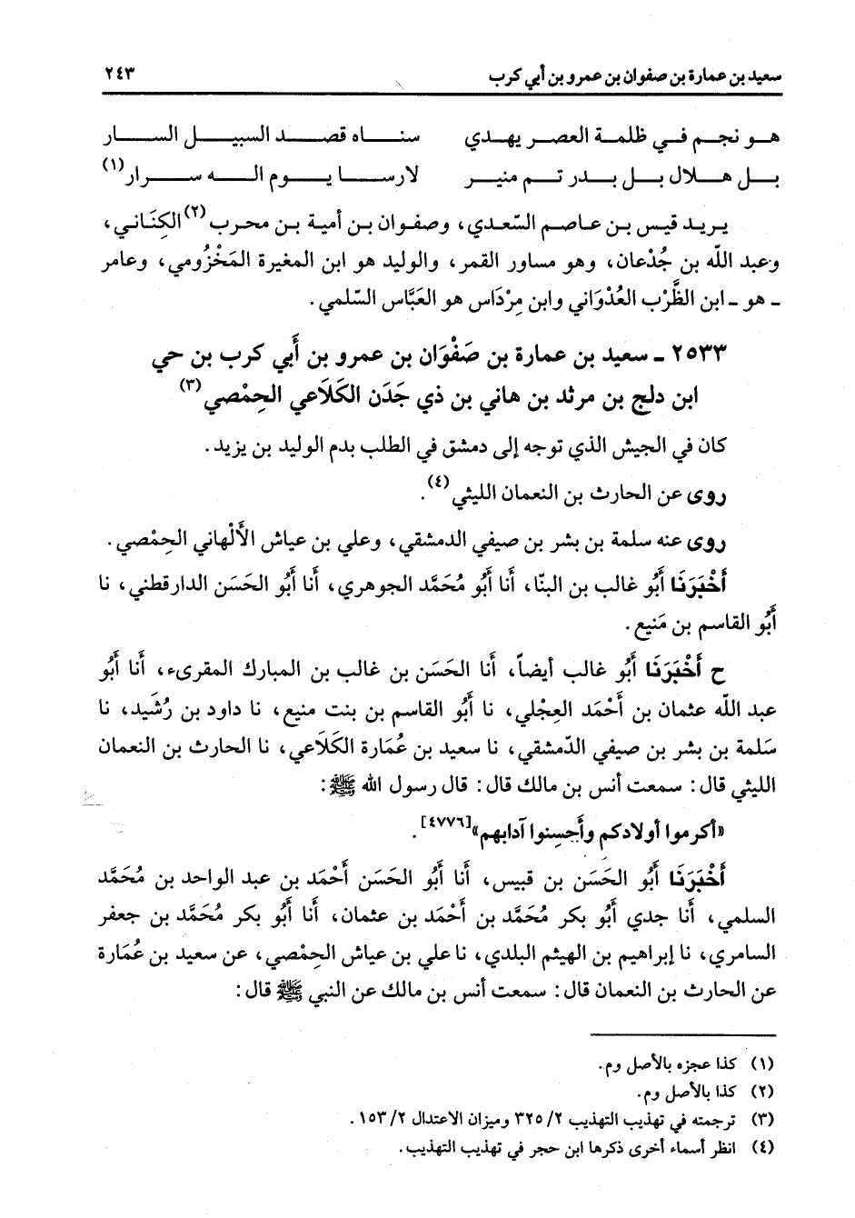 2533 - سعيد بن عمارة بن صفوان بن عمرو بن أبي كرب بن حي ابن دلج بن مرثد بن هاني بن ذي جدن الكلاعي الحمصي (3) كان في الجيش الذي توجه إلى دمشق في الطلب بدم الوليد بن يزيد روى عن الحارث بن النعمان الليثي (4) روى عنه سلمة بن بشر بن صيفي الدمشقي وعلي بن عياش الألهاني الحمصي أخبرنا أبو غالب بن البنا أنا أبو محمد الجوهري أنا أبو الحسن الدارقطني نا أو القاسم بن منيع ح أخبرنا أبو غالب أيضا أنا الحسن بن غالب بن المبارك المقرئ أنا أبو عبد الله عثمان بن أحمد العجلي نا أبو القاسم بن بنت منيع نا داود بن رشيد نا سلمة بن بشر بن صيفي الدمشقي نا سعيد بن عمارة الكلاعي نا الحارث بن النعمان الليثي قال سمعت أنس بن مالك قال قال رسول الله (صلى الله عليه وسلم) أكرموا أولادكم وأحسنوا آدابهم أخبرنا أبو الحسن بن قبيس أنا أبو الحسن أحمد بن عبد الواحد بن محمد السلمي أنا جدي أبو بكر محمد بن أحمد بن عثمان أنا أبو بكر محمد بن جعفر السامري نا إبراهيم بن الهيثم البلدي نا علي بن عياش الحمصي عن سعيد بن عمارة عن الحارث بن النعمان قال سمعت أنس بن مالك عن النبي (صلى الله عليه وسلم) قال