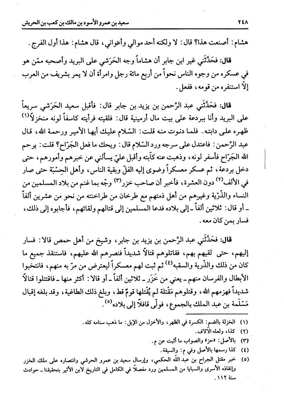 (5) خبر مقتل الجراح بن عبد الله الحكمي وإرسال سعيد بن عمرو الحرشي وانتصاره على ملك الخزر وإنقاذه الاسرى والسبايا من المسلمين ورد مفصلا في الكامل في التاريخ لابن الاثير بتحقيقنا - حوادث سنة 112