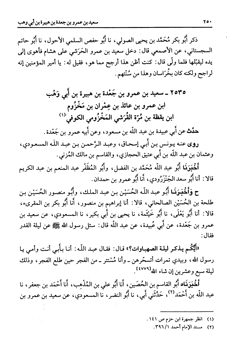 2535 - سعيد بن عمرو بن جعدة بن هبيرة بن أبي وهب ابن عمرو بن عائذ بن عمران بن مخزوم ابن يقظة بن مرة القرشي المخزومي الكوفي (1) حدث عن أبي عبيدة بن عبد الله بن مسعود وعن أبيه عمرو بن جعدة روى عن يونس بن أبي إسحاق وعبد الرحمن بن عبد الله المسعودي وعثمان بن عبد الله بن أبي عتيق الحجازي والقاسم بن مالك المزني أخبرنا أبو عبد الله محمد بن الفضل وأبو المظفر عبد المنعم بن عبد الكريم قالا أنا أبو سعد الجنزرودي أنا أبو عمرو بن حمدان ح وأخبرنا أبو عبد الله الحسين بن عبد الملك وأبو منصور الحسين بن طلحة بن الحسين الصالحاني قالا أنا إبراهيم بن منصور أنا أبو بكر بن المقرئ قالا أنا أبو يعلى نا أبو خيثمة نا يحيى بن أبي بكير نا المسعودي عن سعيد بن عمرو بن جعدة عن أبي عبيدة عن عبد الله قال سئل رسول الله (صلى الله عليه وسلم) عن ليلة القدر فقال أيكم يذكر ليلة الصهباوات قال فقال عبد الله أنا بأبي أنا وأمي يا رسول الله وبيدي تمرات أتسحرهن وأنا مستتر من الفجر حين طلع الفجر وذلك ليلة سبع وعشرين إن شاء الله أخبرناه أبو القاسم بن الحصين أنا أبو علي بن المذهب أنا أحمد بن جعفر نا عبد الله بن أحمد (2) حدثني أبي نا أبو النضر نا المسعودي عن سعيد بن عمرو بن