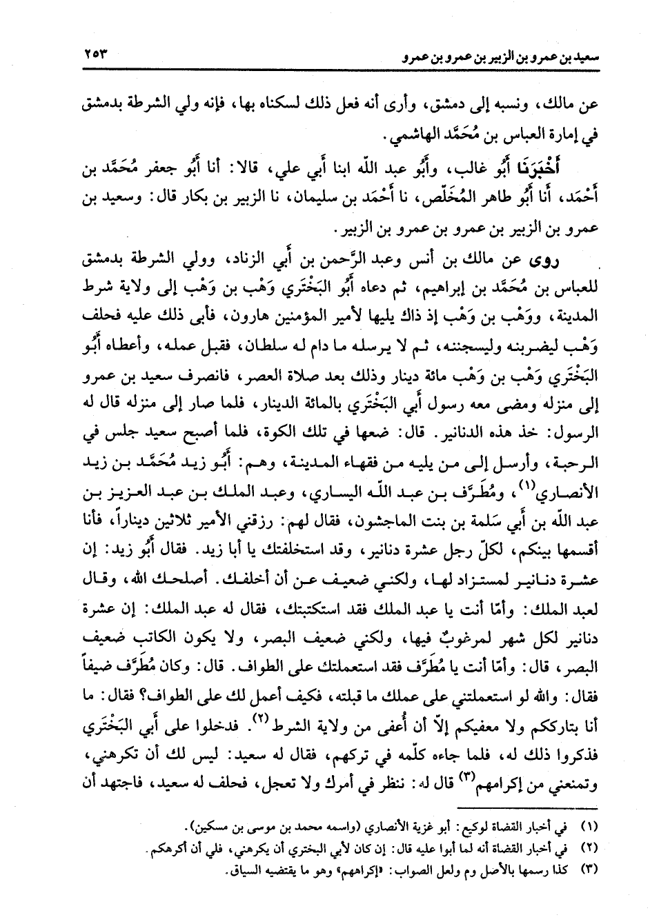 عن مالك ونسبه إلى دمشق وأرى أنه فعل ذلك لسكناه بها فإنه ولي الشرطة بدمشق في إمارة العباس بن محمد الهاشمي أخبرنا أبو غالب وأبو عبد الله ابنا أبي علي قالا أنا أبو جعفر محمد بن أحمد أنا أبو طاهر المخلص نا أحمد بن سليمان نا الزبير بن بكار قال وسعيد بن عمرو بن الزبير بن عمرو بن عمرو بن الزبير روى عن مالك بن أنس وعبد الرحمن بن أبي الزناد وولي الشرطة بدمشق للعباس بن محمد بن إبراهيم ثم دعاه أبو البختري وهب بن وهب إلى ولاية شرط المدينة ووهب بن وهب إذ ذاك يليها لأمير المؤمنين هارون فأبى ذلك عليه فحلف وهب ليضربنه وليسجننه ثم لا يرسله ما دام له سلطان فقبل عمله وأعطاه أبو البختري وهب بن وهب مائة دينار وذلك بعد صلاة العصر فانصرف سعيد بن عمرو إلى منزله ومضى معه رسول أبي البختري بالمائة الدينار فلما صار إلى منزله قال له الرسول خذ هذه الدنانير قال ضعها في تلك الكوفة فلما أصبح سعيد جلس في الرحبة وأرسل إلى من يليه من فقهاء المدينة وهم أبو زيد محمد بن زيد الأنصاري ومطرف بن عبد الله اليساري وعبد الملك بن عبد العزيز بن عبد الله بن أبي سلمة بن بنت الماجشون فقال لهم رزقني الأمير ثلاثين دينارا فأنا أقسمها بينكم لكل رجل عشرة دنانير وقد استخلصتك يا أبا زيد فقال أبو زيد إن عشرة دنانير لمستزاد لها ولكني ضعيف عن أن أخلفك أصلحك الله وقال لعبد الملك وأما أنت يا عبد الملك فقد استكتبتك فقال له عبد الملك إن عشرة دنانير لكل شهر لمرغوب فيها ولكني ضعيف البصر ولا يكون الكاتب ضعيف البصر قال وأما أنت يا مطرف فقد استعملتك على الطواف قال وكان مطرف ضيفا فقال والله لو استعملتني على عملك ما قبلته فكيف أعمل لك على الطواف فقال ما أنا بتارككم ولا معفيكم إلا أن أعفى من ولاية الشرط (2) فدخلوا على أبي البختري فذكروا ذلك له فلما جاءه كلمه في تركهم فقال له سعيد ليس لك أن تكرهني وتمنعني من إكرامهم (3) قال له ننظر في أمرك ولا تعجل فحلف له سعيد فاجتهد أن