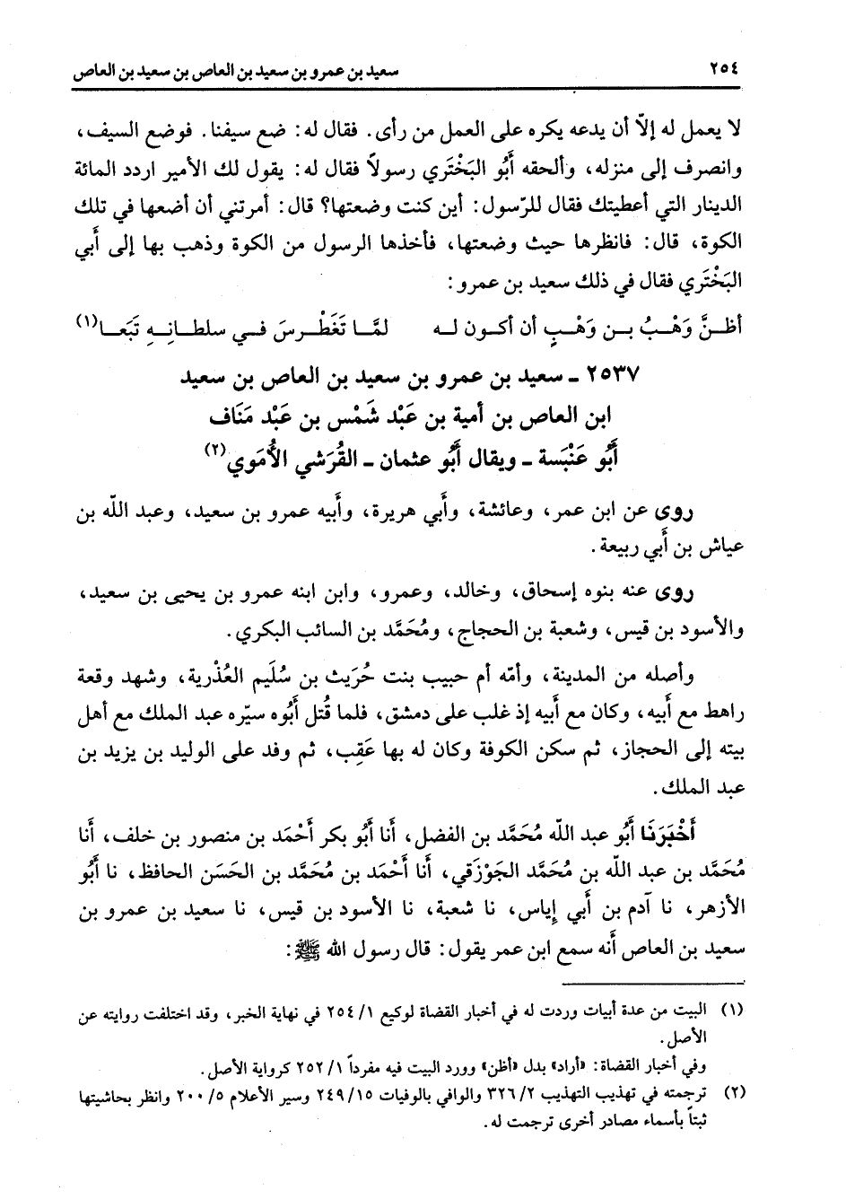 2537 - سعيد بن عمرو بن سعيد ابن العاص بن سعيد ابن العاص بن أمية بن عبد شمس بن عبد مناف أبو عنبسة ويقال أبو عثمان القرشي الأموي (2) روى عن ابن عمر وعائشة وأبي هريرة وأبيه عمرو بن سعيد وعبد الله بن عياش بن أبي ربيعة روى عنه بنوه إسحاق وخالد وعمرو وابن ابنه عمرو بن يحيى بن سعيد والأسود بن قيس وشعبة بن الحجاج ومحمد بن السائب البكري وأصله من المدينة وأمه أم حبيب بنت حريث بن سليم العذرية وشهد وقعة راهط مع أبيه وكان مع أبيه إذ غلب على دمشق فلما قتل أبوه سيره عبد الملك مع أهل بيته إلى الحجاز ثم سكن الكوفة وكان له بها عقب ثم وفد على الوليد بن يزيد بن عبد الملك أخبرنا أبو عبد الله محمد بن الفضل أنا أبو بكر أحمد بن منصور بن خلف أنا محمد بن عبد الله بن محمد الجوزقي أنا أحمد بن محمد بن الحسن الحافظ نا أبو الأزهر نا آدم بن أبي إياس نا شعبة نا الأسود بن قيس نا سعيد بن عمرو بن سعيد بن العاص أنه سمع ابن عمر يقول قال رسول الله (صلى الله عليه وسلم)