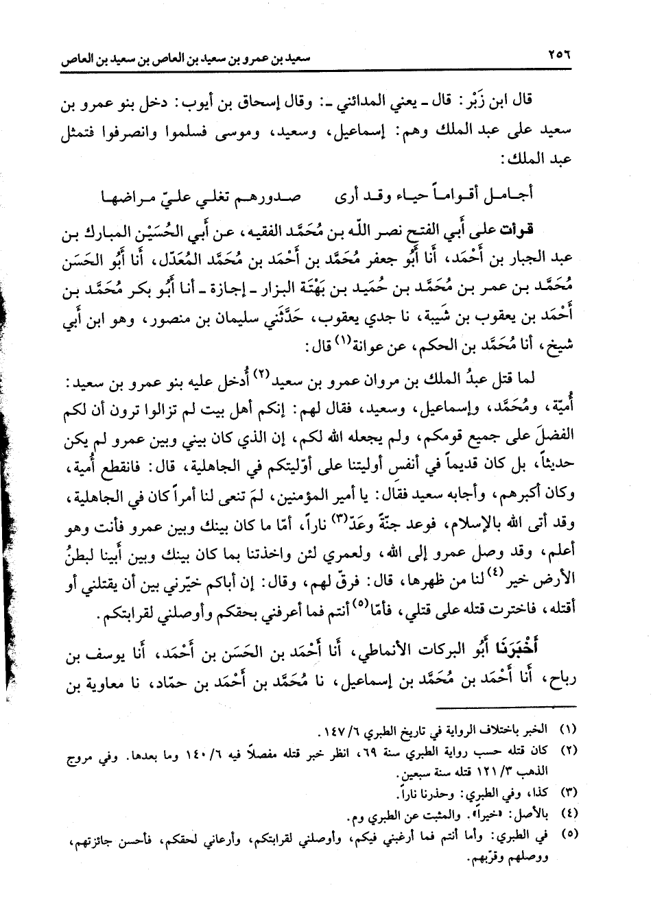 قال ابن زبر قال يعني المدائني وقال إسحاق بن أيوب دخل بنو عمرو بن سعيد علي عبد الملك وهم إسماعيل وسعيد وموسى فسلموا وانصرفوا فتمثل عبد الملك أجامل أقواما حياء وقد أرى * صدورهم تغلي علي مراضها * قرأت على أبي الفتح نصر الله بن محمد الفقيه عن أبي الحسين المبارك بن عبد الجبار بن أحمد أنا أبو جعفر محمد بن أحمد بن محمد المعدل أنا أبو الحسن محمد بن عمر بن محمد بن حميد بن بهتة البزار إجازة أنا أبو بكر محمد بن أحمد بن يعقوب بن شيبة نا جدي يعقوب حدثني سليمان بن منصور وهو ابن أبي شيخ أنا محمد بن الحكم عن عوانة (1) قال لما قتل عبد الملك بن مروان عمرو بن سعيد (2) أدخل عليه بنو عمرو بن سعيد أمية ومحمد وإسماعيل وسعيد فقال لهم إنكم أهل بيت لم تزالوا ترون أن لكم الفضل على جميع قومكم ولم يجعله الله لكم إن الذي كان بيني وبين عمرو لم يكن حديثا بل كان قديما في أنفس أوليتنا على أوليتكم في الجاهلية قال فانقطع أمية وكان أكبرهم وأجابه سعيد فقال يا أمير المؤمنين لم تنعى لنا أمرا كان في الجاهلية وقد أتى الله بالإسلام فوعد جنة وعد (3) نارا أما ما كان بينك وبين عمرو فأنت وهو أعلم وقد وصل عمرو إلى الله ولعمري لئن واخذتنا بما كان بينك وبين أبينا لبطن الأرض خير (4) لنا من ظهرها قال فرق لهم وقال إن أباكم خيرني بين أن يقتلني أو أقتله فاخترت قتله على قتلي فأما (5) أنتم فما أعرفني بحقكم وأوصلني لقرابتكم أخبرنا أبو البركات الأنماطي أنا أحمد بن الحسن بن أحمد أنا يوسف بن رباح أنا أحمد بن محمد بن إسماعيل نا محمد بن أحمد بن حماد نا معاوية بن