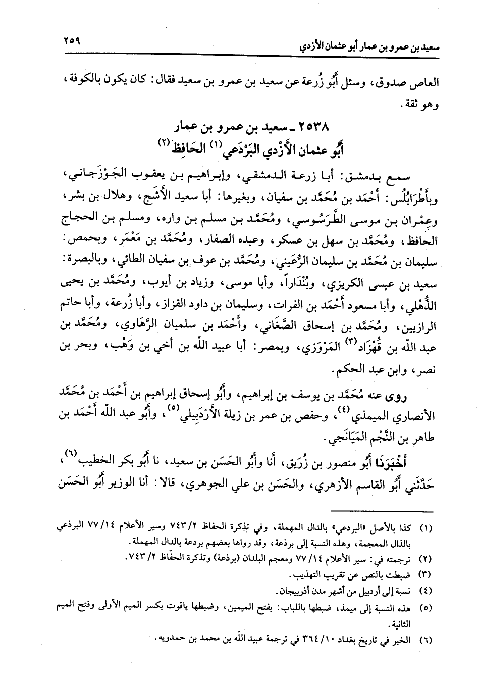 (1) كذا بالاصل " البردعي " بالدال المهملة وفي تذكرة 2 / 743 وسير الاعلام 14 / 77 البرذعي بالذال المعجمة وهذه النسبة إلى برذعة وقد رواها بعضهم بردعة بالدال المهملة