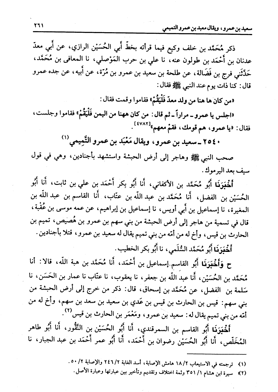 2540 - سعيد بن عمرو ويقال معبد بن عمرو التميمي (1) صحب النبي (صلى الله عليه وسلم) وهاجر إلى أرض الحبشة واستشهد بأجنادين وهي في قول سيف بعد اليرموك أخبرنا أبو محمد بن الأكفاني أنا أبو بكر أحمد بن علي بن ثابت أنا أبو الحسين بن الفضل أنا محمد بن عبد الله بن عتاب أنا القاسم بن عبد الله بن المغيرة نا إسماعيل بن أبي أويس نا إسماعيل بن إبراهيم عن عمه موسى بن عقبة قال في تسمية من هاجر إلى أرض الحبشة من بني سهم بن عمرو بن هصيص تميم بن الحارث بن قيس وأخ له من أمه من بني تميم يقال له سعيد بن عمرو قتلا بأجنادين أخبرنا أبو محمد السلمي نا أبو بكر الخطيب ح وأخبرنا أبو القاسم إسماعيل بن أحمد أنا محمد بن هبة الله قالا أنا محمد بن الحسين أنا عبد الله بن جعفر نا يعقوب نا عتاب نا عمار بن الحسن نا سلمة بن الفضل عن محمد بن إسحاق قال ذكر من خرج إلى أرض الحبشة من بني سهم قيس بن الحارث بن قيس بن عدي بن سعيد بن سعد بن سهم وأخ له من أمه من بني تميم يقال له سعيد بن عمرو ومعمر بن الحارث بن قيس (2) أخبرنا أبو القاسم بن السمرقندي أنا أبو الحسين بن النقور أنا أبو طاهر المخلص أنا أبو الحسين رضوان بن أحمد أنا أبو عمر أحمد بن عبد الجبار نا
