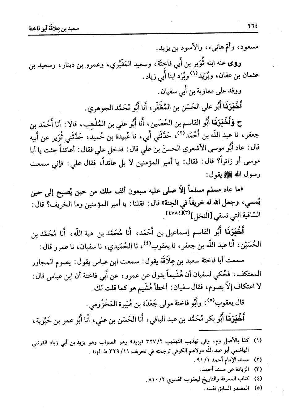 مسعود وأم هانئ والأسود بن يزيد روى عنه ابنه بن ثوير أبي فاختة وسعيد المقبري وعمرو بن دينار وسعيد بن عثمان بن عفان وبزيد (1) وبريد ابنا أبي زياد ووفد علي معاوية بن أبي سفيان أخبرنا أبو علي الحسن بن المظفر أنا أبو محمد الجوهري ح وأخبرنا أبو القاسم بن الحصين أنا أبو علي بن المذهب قالا أنا أحمد بن جعفر نا عبد الله بن أحمد (2) حدثني أبي نا عبيدة بن حميد حدثني ثوير عن أبيه قال عاد أبو موسى الأشعري الحسن بن علي قال فدخل علي فقال أعائدا جئت يا أبا موسى أو زائرا قال فقال يا أمير المؤمنين لا بل عائدا فقال علي فإني سمعت رسول الله (صلى الله عليه وسلم) يقول ما عاد مسلم مسلما إلا صلى عليه سبعون ألف ملك من حين يصبح إلى حين يمسي وجعل الله له خريفا في الجنة قال فقلنا يا أمير المؤمنين وما الخريف قال الساقية التي تسقي النخل (3) أخبرنا أبو القاسم إسماعيل بن أحمد أنا محمد بن هبة الله أنا محمد بن الحسين أنا عبد الله بن جعفر نا يعقوب (4) نا الحميدي نا سفيان نا عمرو قال سمعت أبا فاختة سعيد بن علاقة يقول سمعت ابن عباس يقول يصوم المجاور المعتكف فحكي لسفيان أن هشيما يقول عن عمرو عن أبي فاختة أن ابن عباس قال لا اعتكاف إلا بصوم فقال سفيان أخطأ هشيم هو كما قلت لك قال يعقوب (5) وأبو فاختة مولى جعدة بن هبيرة المخزومي أخبرنا أبو بكر محمد بن عبد الباقي أنا الحسن بن علي أنا أبو عمر بن حيوية