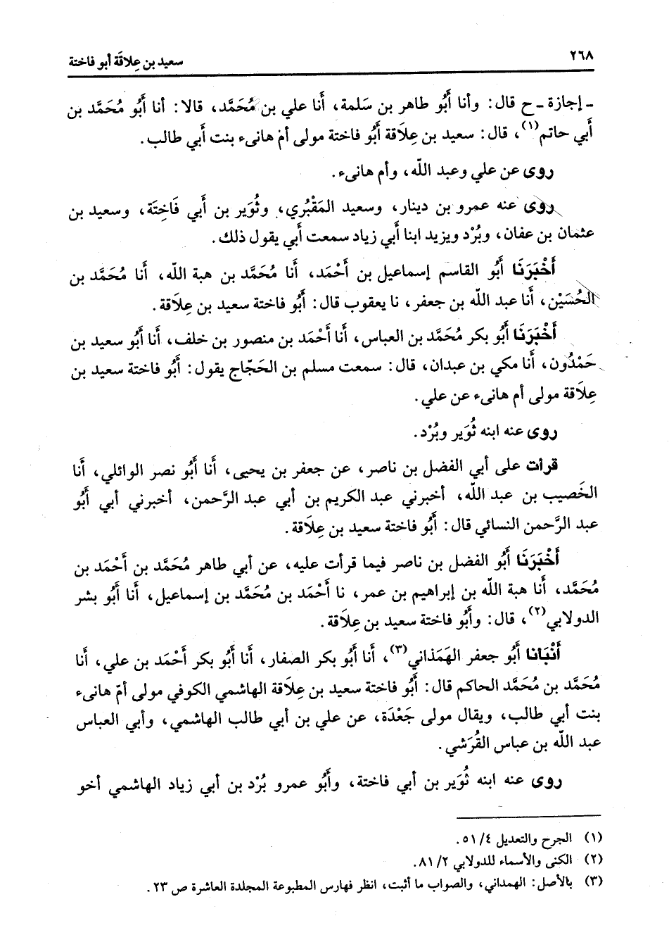 إجازة قال وأنا أبو طاهر بن سلمة أنا علي بن محمد قالا أنا أبو محمد بن أبي حاتم (1) قال سعيد بن علاقة أبو فاختة مولى أم هانئ بنت أبي طالب روى عن علي وعبد الله وأم هانئ روى عنه عمرو بن دينار وسعيد المقبري وثوير بن أبي فاختة وسعيد بن عثمان بن عفان وبرد ويزيد ابنا أبي زياد سمعت أبي يقول ذلك أخبرنا أبو القاسم إسماعيل بن أحمد أنا محمد بن هبة الله أنا محمد بن الحسين أنا عبد الله بن جعفر نا يعقوب قال أبو فاختة سعيد بن علاقة أخبرنا أبو بكر محمد بن العباس أنا أحمد بن منصور بن خلف أنا أبو سعيد بن حمدون أنا مكي بن عبدان قال سمعت مسلم بن الحجاج يقول أبو فاختة سعيد بن علاقة مولى أم هانئ عن علي روى عنه ابنه ثوير وبرد قرأت على أبي الفضل بن ناصر عن جعفر بن يحيى أنا أبو نصر الوائلي أنا الخصيب بن عبد الله أخبرني عبد الكريم بن أبي عبد الرحمن أخبرني أبي أبو عبد الرحمن النسائي قال أبو فاختة سعيد بن علاقة أخبرنا أبو الفضل بن ناصر فيما قرأت عليه عن أبي طاهر محمد بن أحمد بن محمد أنا هبة الله بن إبراهيم بن عمر نا أحمد بن محمد بن إسماعيل أنا أبو بشر الدولابي (2) قال وأبو فاختة سعيد بن علاقة أنبأنا أبو جعفر الهمذاني (3) أنا أبو بكر الصفار أنا أبو بكر أحمد بن علي أنا محمد بن محمد الحاكم قال أبو فاختة سعيد بن علاقة الهاشمي الكوفي مولى أم هانئ بنت أبي طالب ويقال مولى جعدة عن علي بن أبي طالب الهاشمي وأبي العباس عبد الله بن عباس القرشي روى عنه ابنه ثوير بن أبي فاختة وأبو عمرو برد بن أبي زياد الهاشمي أخو