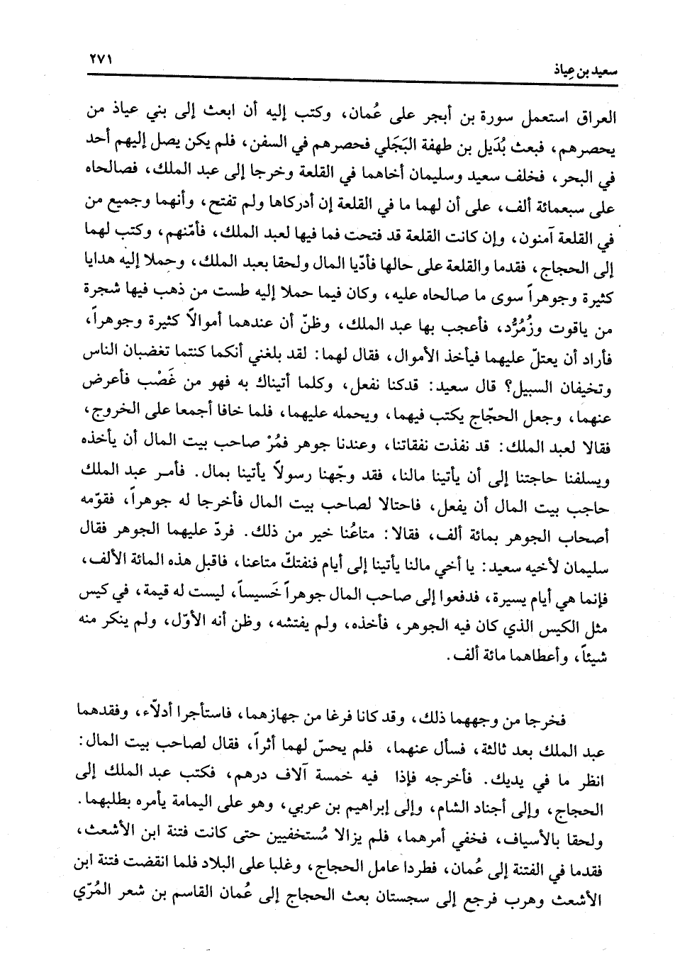العراق استعمل سورة بن أبجر على عمان وكتب إليه أن ابعث إلى بني عياذ من يحصرهم فبعث بديل بن طهفة البجلي فحصرهم في السفن فلم يكن يصل إليهم أحد في البحر فخلف سعيد وسليمان أخاهما في القلعة وخرجا إلى عبد الملك فصالحاه على سبعمائة ألف على أن لهما ما في القلعة إن أدركاها ولم تفتح وأنهما وجميع من في القلعة آمنون وإن كانت القلعة قد فتحت فما فيها لعبد الملك فأمنهم وكتب لهما إلى الحجاج فقدما والقلعة على حالها فأديا المال ولحقا بعبد الملك وحملا إليه هدايا كثيرة وجوهرا سوى ما صالحاه عليه وكان فيما حملا إليه طست من ذهب فيها شجرة من ياقوت وزمرد فأعجب بها عبد الملك وظن أن عندهما أموالا كثيرة وجوهرا فأراد أن يعتل عليهما فيأخذ الأموال فقال لهما لقد بلغني أنكما كنتما تغضبان الناس وتخيفان السبيل قال سعيد قد كنا نفعل وكلما أتيناك به فهو من غضب فأعرض عنهما وجعل االحجاج يكتب فيهما ويحمله عليهما فلما خافا أجمعا على الخروج فقالا لعبد الملك قد نفذت نفقاتنا وعندنا جوهر فمر صاحب بيت المال أن يأخذه ويسلفنا حاجتنا إلى أن يأتينا مالنا فقد وجهنا رسولا يأتينا بمال فأمر عبد الملك حاجب بيت المال أن يفعل فاحتالا لصاحب بيت المال فأخرجا له جوهرا فقومه أصحاب الجوهر بمائة ألف فقالا متاعنا خير من ذلك فرد عليهما الجوهر فقال سليمان لأخيه سعيد يا أخي ما لنا يأتينا إلى أيام فنفتك متاعنا فأقبل هذه المائة الألف فإنما هي أيام يسيرة فدفعوا إلى صاحب المال جوهرا خسيسا ليست له قيمة في كيس مثل الكيس الذي كان فيه الجوهر فأخذه ولم يفتشه وظن أنه الأول ولم ينكر منه شيئا وأعطاهما مائة ألف فخرجا من وجههما ذلك وقد كانا فرغا من جهازهما فاستأجرا أدلاء وفقدهما عبد الملك بعد ثالثة فسأل عنهما فلم يحس لهما أثرا فقال لصاحب بيت المال انظر ما في يديك فأخرجه فإذا فيه خمسة آلاف درهم فكتب عبد الملك إلى الحجاج وإلى أجناد الشام وإلى إبراهيم بن عربي وهو على اليمامة يأمره بطلبهما ولحقا بالأسياف فخفي أمرهما فلم يزالا مستخفين حتى كانت فتنة ابن الأشعث فقدما في الفتنة إلى عمان فطردا عامل الحجاج وغلبا على البلاد فلما انقضت فتنة ابن الأشعث وهرب فرجع إلى سجستان بعث الحجاج إلى عمان القاسم بن شعر المري