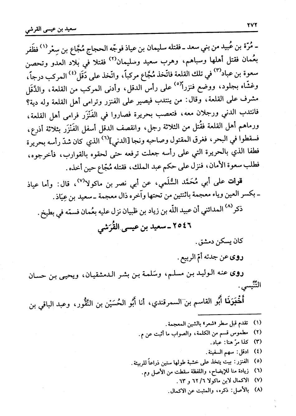 2546 - سعيد بن عيسى القرشي كان يسكن دمشق روى عن جدته أم الربيع روى عنه الوليد بن مسلم وسلمة بن بشر الدمشقيان ويحيى بن حسان التنيسي أخبرنا أبو القاسم بن السمرقندي أنا أبو الحسين بن النقور وعبد الباقي بن
