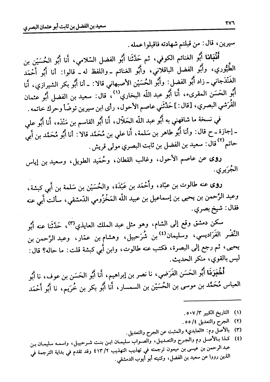 سيرين قال من قبلتم شهادته فاقبلوا عمله أنبأنا أبو الغنائم الكوفي ثم حدثنا أبو الفضل السلامي أنا أبو الحسين بن الطيوري وأبو الفضل الباقلاني وأبو الغنائم واللفظ له قالوا أنا أبو أحمد العندجاني زاد أبو الفضل وأبو الحسين الأصبهاني قالا أنا أبو بكر الشيرازي أنا أبو الحسن المقرئ أنا أبو عبد الله البخاري (1) قال سعيد بن الفضل أبو عثمان القرشي البصري قال حدثني عاصم الأحول رأى ابن سيرين توضأ وحرك خاتمه في نسخة ما شافهني به أبو عبد الله الحلال أنا أبو القاسم بن مندة أنا أبو علي إجازة قال وأنا أبو طاهر بن سلمة أنا علي بن محمد قالا أنا أبو محمد بن أبي حاتم (2) قال سعيد بن الفضل بن ثابت البصري مولى قريش روى عن عاصم الأحول وغالب القطان وحميد الطويل وسعيد بن إياس الجريري روى عنه طالوت بن عباد وأحمد بن عبدة والحسين بن سلمة بن أبي كبشة وعبد الرحمن بن يحيى بن إسماعيل بن عبيد الله المخزومي الدمشقي سألت أبي عنه فقال شيخ بصري سكن دمشق وقع إلى الشام وهو مثل عبد الملك العايذي (3) حدثنا عنه أبو النضر الفراديسي وسليمان (4) بن شرحبيل وهشام بن عمار وعبد الرحمن بن يحيى ثم رجع إلى البصرة فكتب عنه طالوت وابن أبي كبشة قلت ما حاله قال ليس بالقوي منكر الحديث أخبرنا أبو الحسن الفرضي نا نصر بن إبراهيم أنا أبو الحسن بن عوف نا أبو العباس محمد بن موسى بن الحسين بن السمسار أنا أبو بكر بن خريم نا أبو أحمد