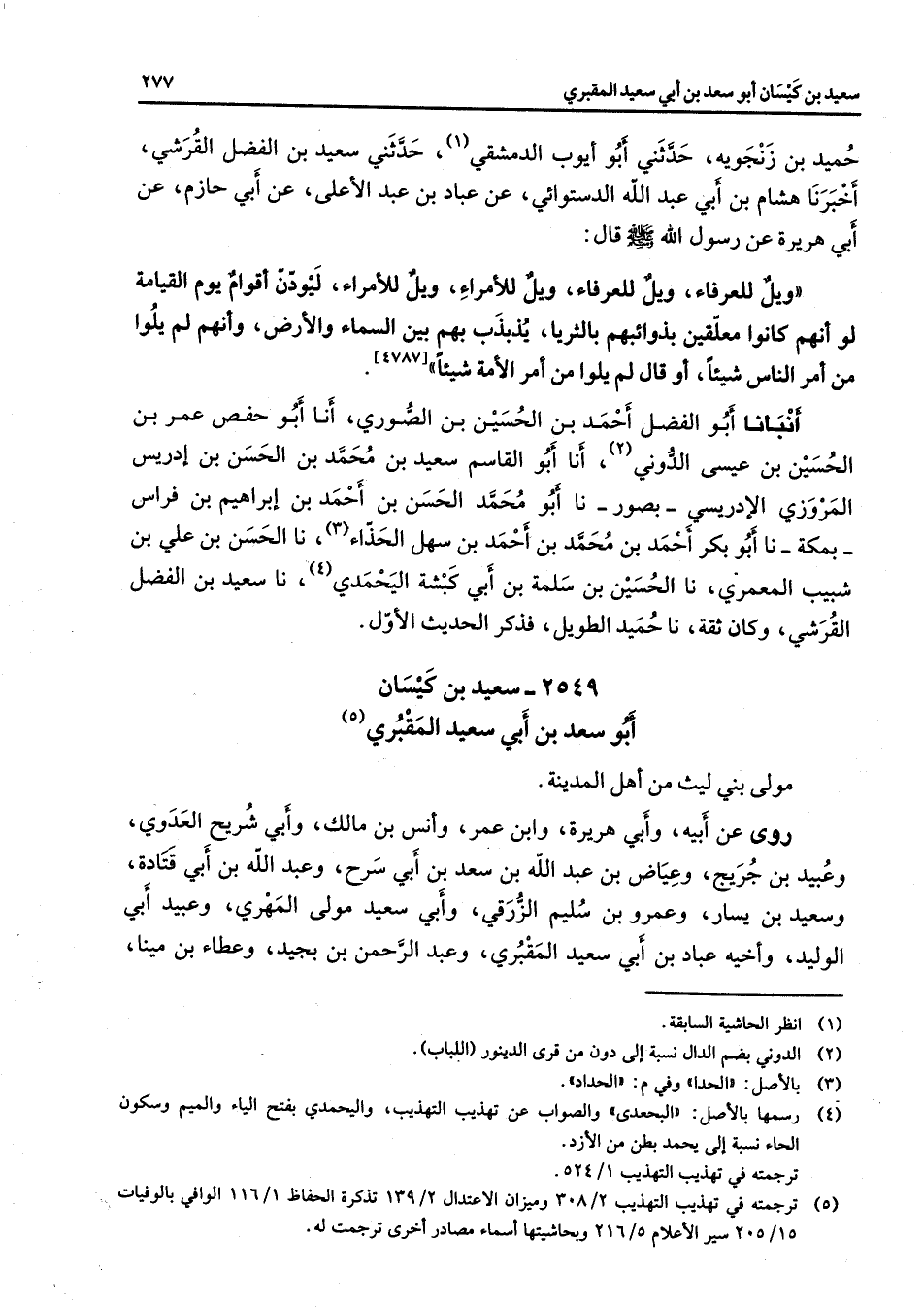 حميد بن زنجويه حدثني أبو أيوب الدمشقي (1) حدثني سعيد بن الفضل القرشي أخبرنا هشام بن أبي عبد الله الدستوائي عن عباد بن عبد الأعلى عن أبي حازم عن أبي هريرة عن رسول الله (صلى الله عليه وسلم) قال ويل للعرفاء ويل للعرفاء ويل للأمراء ويل للأمراء ليودن أقوام يوم القيامة لو أنهم كانوا معلقين بذوائبهم بالثريا يذبذب بهم بين السماء والأرض وأنهم لم يلوا من أمر الناس شيئا أو قال لم يلوا من أمر الأمة شيئا أنبأنا أبو الفضل أحمد بن الحسين بن الصوري أنا أبو حفص عمر بن الحسين بن عيسى الدوني (2) أنا أبو القاسم سعيد بن محمد بن الحسن بن إدريس المروزي الإدريسي بصور نا أبو محمد الحسن بن أحمد بن إبراهيم بن فراس بمكة نا أبو بكر أحمد بن محمد بن أحمد بن سهل الحذاء (3) نا الحسن بن علي بن شبيب المعمري نا الحسين بن سلمة بن أبي كبشة اليحمدي (4) نا سعيد بن الفضل القرشي وكان ثقة نا حميد الطويل فذكر الحديث الأول