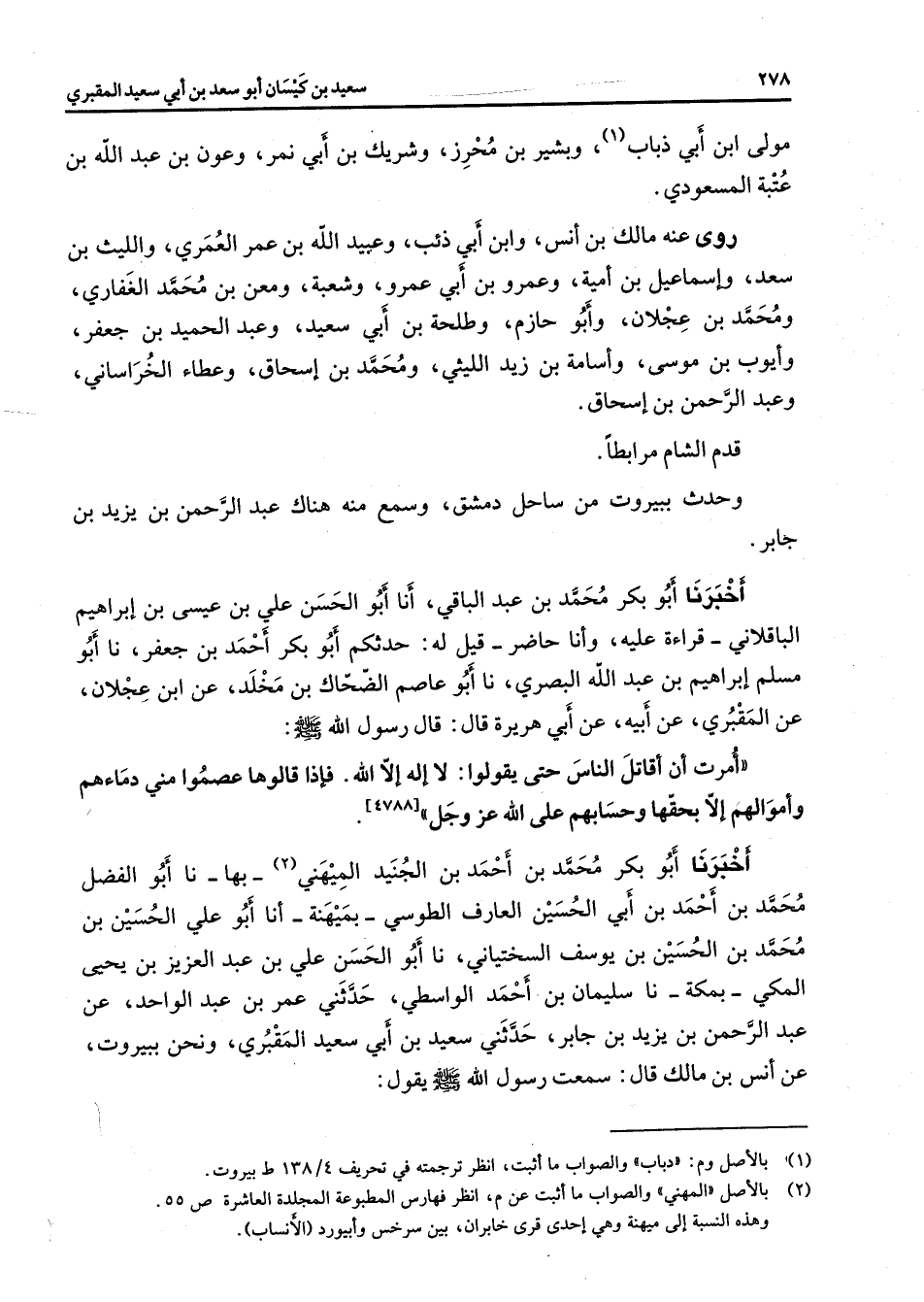 مولى ابن أبي ذباب (1) وبشير بن محرز وشريك بن أبي نمر وعون بن عبد الله بن عتبة المسعودي روى عنه مالك بن أنس وابن أبي ذئب وعبيد الله بن عمر العمري والليث بن سعد وإسماعيل بن أمية وعمرو بن أبي عمرو وشعبة ومعن بن محمد الغفاري ومحمد بن عجلان وأبو حازم وطلحة بن أبي سعيد وعبد الحميد بن جعفر وأيوب بن موسى وأسامة بن زيد الليثي ومحمد بن إسحاق وعطاء الخراساني وعبد الرحمن بن إسحاق قدم الشام مرابطا وحدث ببيروت من ساحل دمشق وسمع منه هناك عبد الرحمن بن يزيد بن جابر أخبرنا أبو بكر محمد بن عبد الباقي أنا أبو الحسن علي بن عيسى بن إبراهيم الباقلاني قراءة عليه وأنا حاضر قيل له حدثكم أبو بكر أحمد بن جعفر نا أبو مسلم إبراهيم بن عبد الله البصري نا أبو عاصم الضحاك بن مخلد عن ابن عجلان عن المقبري عن أبيه عن أبي هريرة قال قال رسول الله (صلى الله عليه وسلم) أمرت أن أقاتل الناس حتى يقولوا لا إله إلا الله فإذا قالوها عصموا مني دماءهم وأموالهم إلا بحقها وحسابهم على الله عز وجل أخبرنا أبو بكر محمد بن أحمد بن الجنيد الميهني (2) بها نا أبو الفضل محمد بن أحمد بن أبي الحسين العارف الطوسي بميهنة أنا أبو علي الحسين بن محمد بن الحسين بن يوسف السختياني نا أبو الحسن علي بن عبد العزيز بن يحيى المكي بمكة نا سليمان بن أحمد الواسطي حدثني عمر بن عبد الواحد عن عبد الرحمن بن يزيد بن جابر حدثني سعيد بن أبي سعيد المقبري ونحن ببيروت عن أنس بن مالك قال سمعت رسول الله (صلى الله عليه وسلم) يقول