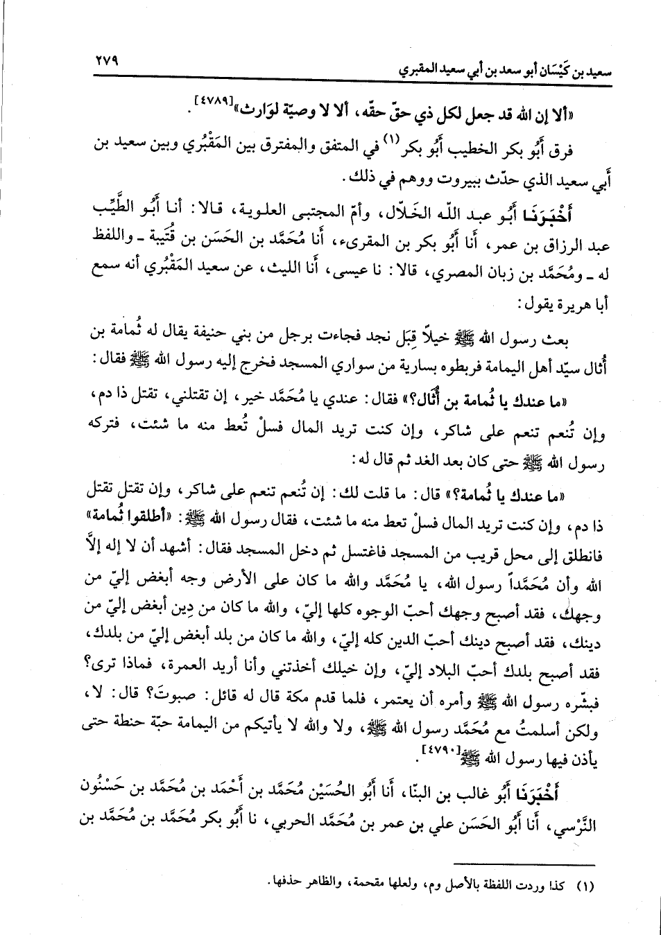 ألا إن الله قد جعل لكل ذي حق حقه إلا لا وصية لوارث فرق أبو بكر الخطيب أبو بكر (1) في المتفق والمفترق بين المقبري وبين سعيد بن أبي سعيد الذي حدث ببيروت ووهم في ذلك أخبرنا أبو عبد الله الخلال وأم المجتبى العلوية قالا أنا أبو الطيب عبد الرزاق بن عمر أنا أبو بكر بن المقرئ أنا محمد بن الحسن بن قتيبة واللفظ له ومحمد بن زبان المصري قالا نا عيسى أنا الليث عن سعيد المقبري أنه سمع أبا هريرة يقول بعث رسول الله (صلى الله عليه وسلم) خيلا قبل نجد فجاءت برجل من بني حنيفة يقال له ثمامة بن أثال سيد أهل اليمامة فربطوه بسارية من سواري المسجد فخرج إليه رسول الله (صلى الله عليه وسلم) فقال ما عندك يا ثمامة بن أثال فقال عندي يا محمد خير إن تقتلني تقتل ذا دم وإن تنعم تنعم على شاكر وإن كنت تريد المال فسل تعط منه ما شئت فتركه رسول الله (صلى الله عليه وسلم) حتى كان بعد الغد ثم قال له ما عندك يا ثمامة قال ما قلت لك إن تنعم تنعم على شاكر وإن تقتل تقتل ذا دم وإن كنت تريد المال فسل تعط منه ما شئت فقال رسول الله (صلى الله عليه وسلم) أطلقوا ثمامة فانطلق إلى محل قريب من المسجد فاغتسل ثم دخل المسجد فقال أشهد أن لا إله إلا الله وأن محمدا رسول الله يا محمد والله ما كان على الأرض وجه أبغض إلي من وجهك فقد أصبح وجهك أحب الوجوه كلها إلي والله ما كان من دين أبغض إلي من دينك فقد أصبح ينك أحب الدين كله إلي والله ما كان من بلد أبغض إلي من بلدك فقد أصبح بلدك أحب البلاد إلي وإن خيلك أخذتني وأنا أريد العمرة فماذا ترى فبشره رسول الله (صلى الله عليه وسلم) وأمره أن يعتمر فلما قدم مكة قال له قائل صبوت قال لا ولكن أسلمت مع محمد رسول الله (صلى الله عليه وسلم) ولا والله لا يأتيكم من اليمامة حبة حنطة حتى يأذن فيها رسول الله (صلى الله عليه وسلم) أخبرنا أبو غالب بن البنا أنا أبو الحسين محمد بن أحمد بن محمد بن حسنون النرسي أنا أبو الحسن علي بن عمر بن محمد الحربي نا أبو بكر محمد بن محمد
