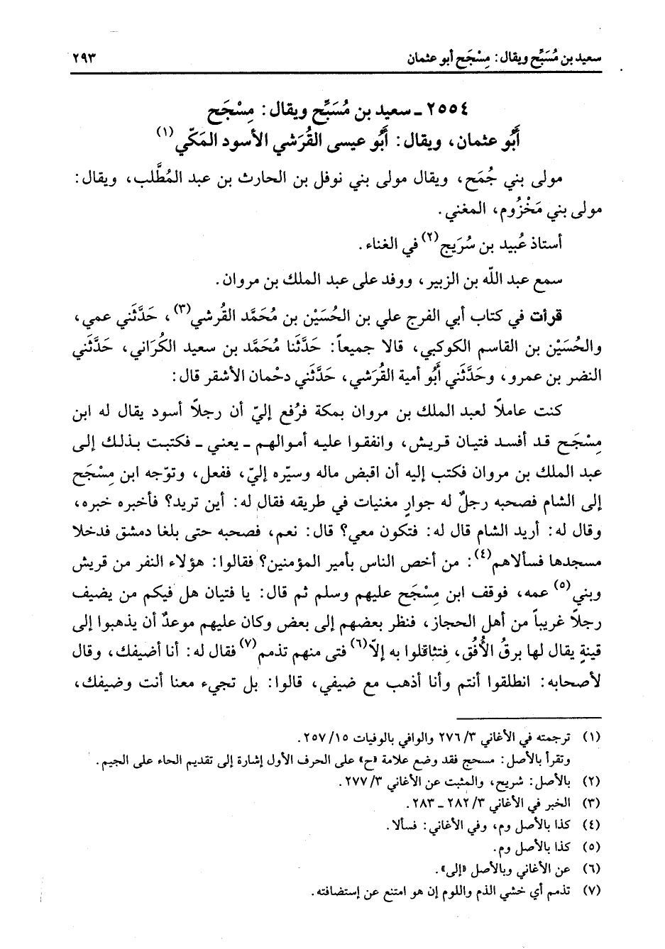 2554 - سعيد بن مسبح ويقال مسجح أبو عثمان ويقال أبو عيسى القرشي الأسود المكي (1) مولى بني جمح ويقال مولى بني نوفل بن الحارث بن عبد المطلب ويقال مولى بني مخزوم المغني أستاذ عبيد بن سريج (2) في الغناء سمع عبد الله بن الزبير ووفد على عبد الملك بن مروان قرأت في كتاب أبي الفرج علي بن الحسين بن محمد القرشي (3) حدثني عمي والحسين بن القاسم الكوكبي قالا جميعا حدثنا محمد بن سعيد الكراني حدثني النضر بن عمرو وحدثني أبو أمية القرشي حدثني دحمان الأشقر قال كنت عاملا لعبد الملك بن مروان بمكة فرفع إلي أن رجلا أسود يقال له ابن مسجح قد أفسد فتيان قريش وانفقوا عليه أموالهم يعني فكتبت بذلك إلى عبد الملك بن مروان فكتب إليه أن أقبض ماله وسيره إلي ففعل وتوجه ابن مسجح إلى الشام فصحبه رجل له جوار معنيات في طريقه فقال له أين تريد فأخبره خبره وقال له أريد الشام قال له فتكون معي قال نعم فصحبه حتى بلغا دمشق فدخلا مسجدها فسألاهم (4) من أخص الناس بأمير المؤمنين فقالوا هؤلاء النفر من قريش وبني (5) عمه فوقف ابن مسجح عليهم وسلم ثم قال يا فتيان هل فيكم من يضيف رجلا غريبا من أهل الحجاز فنظر بعضهم إلى بعض وكان عليهم موعد أن يذهبوا إلى قينة يقال لها برق الأفق فتثاقلوا به إلا (6) فتى منهم تذمم (7) فقال له أنا أضيفك وقال لأصحابه انطلقوا أنتم وأنا أذهب مع ضيفي قالوا بل تجئ معنا أنت وضيفك