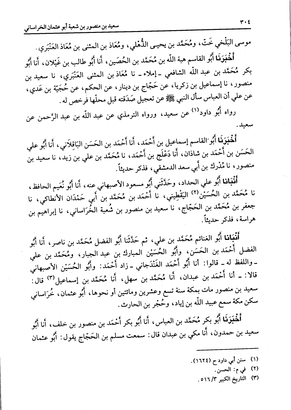 موسى البلخي خت ومحمد بن يحيى الذهلي ومعاذ بن المثنى بن معاذ العنبري أخبرنا أبو القاسم هبة الله بن محمد بن الحصين أنا أبو طالب بن غيلان أنا أبو بكر محمد بن عبد الله الشافعي إملاء نا معاذ بن المثنى العنبري نا سعيد بن منصور نا إسماعيل بن زكريا عن حجاج بن دينار عن الحكم عن حجية بن عدي عن علي أن العباس سأل النبي (صلى الله عليه وسلم) عن تعجيل صدقته قبل محلها فرخص له رواه أبو داود (1) عن سعيد ورواه الترمذي عن عبد الله بن عبد الرحمن عن سعيد أخبرنا أبو القاسم إسماعيل بن أحمد أنا أحمد بن الحسن الباقلاني أنا أبو علي الحسن بن أحمد بن شاذان أنا دعلج بن أحمد نا محمد بن علي بن زيد نا سعيد بن منصور نا مدرك بن أبي سعد الدمشقي فذكر حديثا أنبأنا أبو علي الحداد وحدثني أبو مسعود الأصبهاني عنه أنا أبو نعيم الحافظ نا محمد بن الحسين (2) اليقطيني نا أحمد بن محمد بن أبي حمدان الأنطاكي نا جعفر بن محمد بن الحجاج نا سعيد بن منصور بن شعبة الخراساني نا إبراهيم بن هراسة فذكر حديثا أنبأنا أبو الغنائم محمد بن علي ثم حدثنا أبو الفضل محمد بن ناصر أنا أبو الفضل أحمد بن الحسن وأبو الحسين المبارك بن عبد الجبار ومحمد بن علي وللفظ له قالوا أنا أبو أحمد الغندجاني زاد أحمد وأبو الحسين الأصبهاني قالا أنا أحمد بن عبدان أنا محمد بن سهل أنا محمد بن إسماعيل (3) قال سعيد بن منصور مات بمكة سنة تسع وعشرين ومائتين أو نحوها أبو عثمان خراساني سكن مكة سمع عبيد الله بن إياد وحجر بن الحارث أخبرنا أبو بكر محمد بن العباس أنا أبو بكر أحمد بن منصور بن خلف أنا أبو سعيد بن حمدون أنا مكي بن عبدان قال سمعت مسلم بن الحجاج يقول أبو عثمان