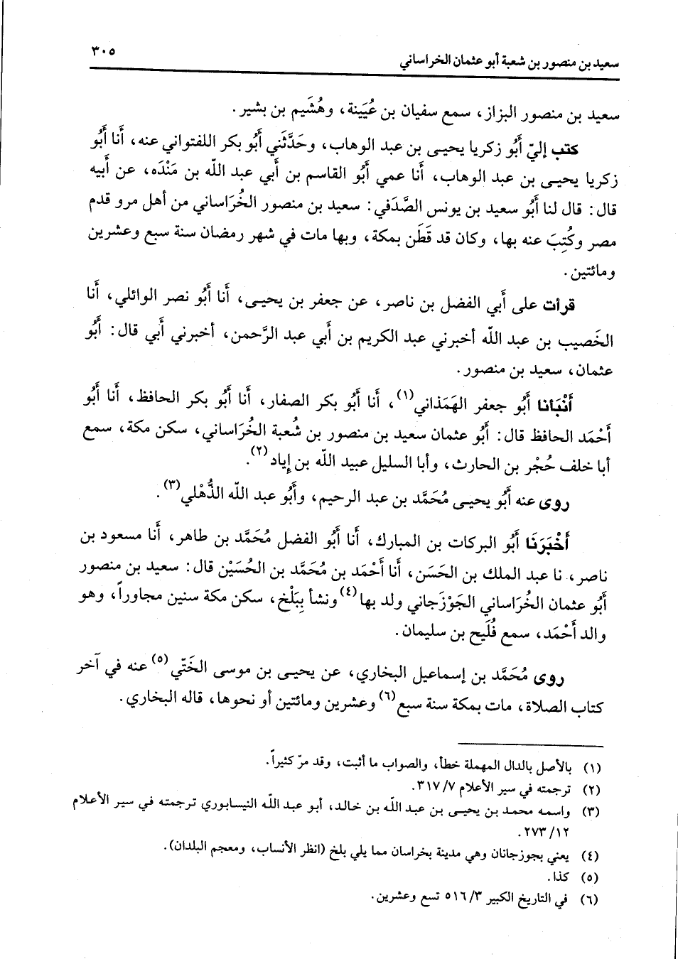 سعيد بن منصور البزاز سمع سفيان بن عيينة وهشيم بن بشير كتب إلي أبو زكريا يحيى بن عبد الوهاب وحدثني أبو بكر اللفتواني عنه أنا أبو زكريا يحيى بن عبد الوهاب أنا عمي أبو القاسم بن أبي عبد الله بن منده عن أبيه قال قال لنا أبو سعيد بن يونس الصدفي سعيد بن منصور الخراساني من أهل مرو قدم مصر وكتب عنه بها وكان قد قطن بمكة وبها مات في شهر رمضان سنة سبع وعشرين ومائتين قرأت على أبي الفضل بن ناصر عن جعفر بن يحيى أنا أبو نصر الوائلي أنا الخصيب بن عبد الله أخبرني عبد الكريم بن أبي عبد الرحمن أخبرني أبي قال أبو عثمان سعيد بن منصور أنبأنا أبو جعفر الهمذاني (1) أنا أبو بكر الصفار أنا أبو بكر الحافظ أنا أبو أحمد الحافظ قال أبو عثمان سعيد بن منصور بن شعبة الخراساني سكن مكة سمع أبا خلف حجر بن الحارث وأبا السليل عبيد الله بن إياد (2) روى عنه أبو يحيى محمد بن عبد الرحيم وأبو عبد الله الذهلي (3) أخبرنا أبو البركات بن المبارك أنا أبو الفضل محمد بن طاهر أنا مسعود بن ناصر نا عبد الملك بن الحسن أنا أحمد بن محمد بن الحسين قال سعيد بن منصور أبو عثمان الخراساني الجوزجاني ولد بها (4) ونشأ ببلخ سكن مكة سنين مجاورا وهو والد أحمد سمع فليح بن سليمان روى محمد بن إسماعيل البخاري عن يحيى بن موسى الختي (5) عنه في آخر كتاب الصلاة مات بمكة سنة سبع (6) وعشرين ومائتين أو نحوها قاله البخاري