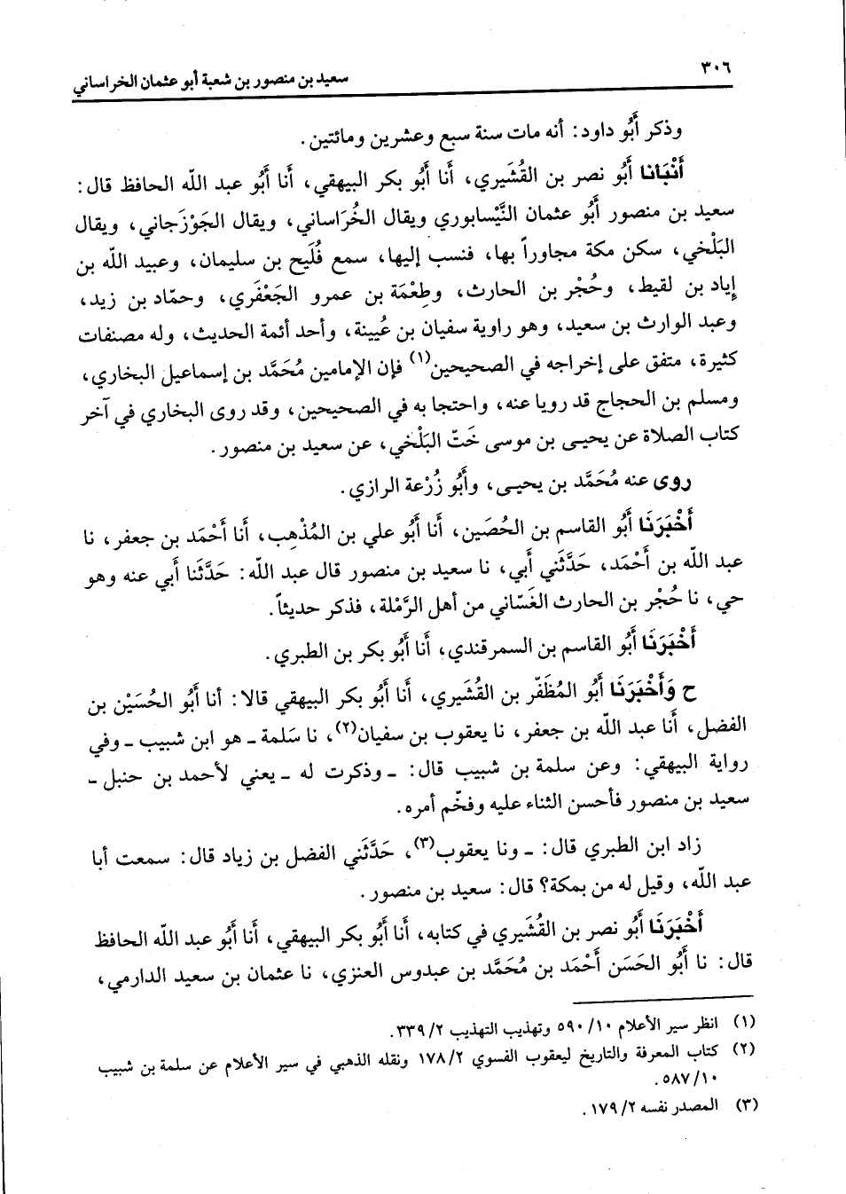 وذكر أبو داود أنه مات سنة سبع وعشرين ومائتين أنبأنا أبو نصر بن القشيري أنا أبو بكر البيهقي أنا أبو عبد الله الحافظ قال سعيد بن منصور أبو عثمان النيسابوري ويقال الخراساني ويقال الجوزجاني ويقال البلخي سكن مكة مجاورا بها فنسب إليها سمع فليح بن سليمان وعبدي الله بن إياد بن لقيط وحجر بن الحارث وطعمة بن عمرو الجعفري وحماد بن زيد وعبد الوارث بن سعيد وهو راوية سفيان بن عيينة وأحد أئمة الحديث وله مصنفات كثيرة متفق على إخراجه في الصحيحين (1) فإن الإمامين محمد بن إسماعيل البخاري ومسلم بن الحجاج قد رويا عنه واحتجا به في الصحيحين وقد روى البخاري في آخر كتاب الصلاة عن يحيى بن موسى خت البلخي عن سعيد بن منصور روى عنه محمد بن يحيى وأبو زرعة الرازي أخبرنا أبو القاسم بن الحصين أنا أبو علي بن المذهب أنا أحمد بن جعفر نا عبد الله بن أحمد حدثني أبي نا سعيد بن منصور قال عبد الله حدثنا أبي عنه وهو حي نا حجر بن الحارث الغساني من أهل الرملة فذكر حديثا أخبرنا أبو القاسم بن السمرقندي أنا أبو بكر بن الطبري ح وأخبرنا أبو المظفر بن القشيري أنا أبو بكر البيهقي قالا أنا أبو الحسين بن الفضل أنا عبد الله بن جعفر نا يعقوب بن سفيان (2) نا سملة هو ابن شبيب وفي رواية البيهقي وعن سلمة بن شبيب قال وذكرت له يعني لأحمد بن حنبل سعيد بن منصور فأحسن الثناء عليه وفخم أمره زاد ابن الطبري قال ونا يعقوب (3) حدثني الفضل بن زياد قال سمعت أبا عبد الله وقيل له من بمكة قال سعيد بن منصور أخبرنا أبو نصر بن القشيري في كتابه أنا أبو بكر البيهقي أنا أبو عبد الله الحافظ قال نا أبو الحسن أحمد بن محمد بن عبدوس العنزي نا عثمان بن سعيد الدارمي
