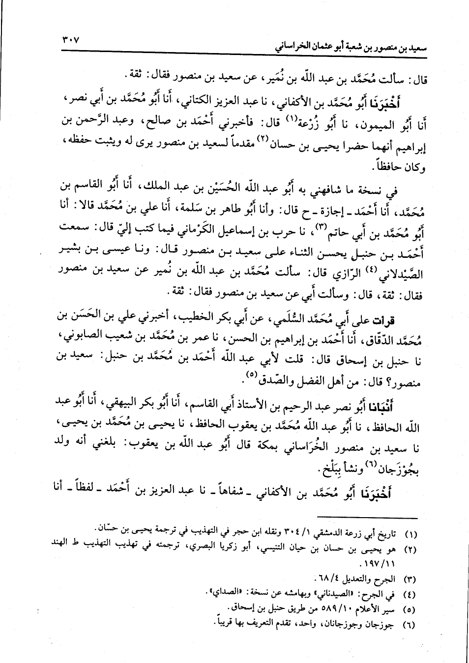 قال سألت محمد بن عبد الله بن نمير عن سعيد بن منصور فقال ثقة أخبرنا أبو محمد بن الأكفاني نا عبد العزيز الكتاني أنا أبو محمد بن أبي نصر أنا أبو الميمون نا أبو زرعة (1) قال فأخبرني أحمد بن صالح وعبد الرحمن بن إبراهيم أنهما حضرا يحيى بن حسان (2) مقدما لسعيد بن منصور يرى له ويثبت حفظه وكان حافظا في نسخة ما شافهني به أبو عبد الله الحسين بن عبد الملك أنا أبو القاسم بن محمد أنا أحمد إجازة قال وأنا أبو طاهر بن سلمة أنا علي بن محمد قالا أنا أبو محمد بن أبي حاتم (3) نا حرب بن إسماعيل الكرماني فيما كتب إلي قال سمعت أحمد بن حنبل يحسن الثناء على سعيد بن منصور قال ونا عيسى بن بشير الصيدلاني (4) الرازي قال سألت محمد بن عبد الله بن نمير عن سعيد بن منصور فقال ثقة قال وسألت أبي عن سعيد بن منصور فقال ثقة قرأت على أبي محمد السلمي عن أبي بكر الخطيب أخبرني علي بن الحسن بن محمد الدقاق أنا أحمد بن إبراهيم بن الحسن نا عمر بن محمد بن شعيب الصابوني نا حنبل بن إسحاق قال قلت لأبي عبد الله أحمد بن محمد بن حنبل سعيد بن منصور قال من أهل الفضل والصدق (5) أنبأنا أبو نصر عبد الرحيم بن الأستاذ أبي القاسم أنا أبو بكر البيهقي أنا أبو عبد الله الحافظ نا أبو عبد الله محمد بن يعقوب الحافظ نا يحيى بن محمد بن يحيى نا سعيد بن منصور الخراساني بمكة قال أبو عبد الله بن يعقوب بلغني أنه ولد بجوزجان (6) ونشأ ببلخ أخبرنا أبو محمد بن الأكفاني شفاها نا عبد العزيز بن أحمد لفظا أنا