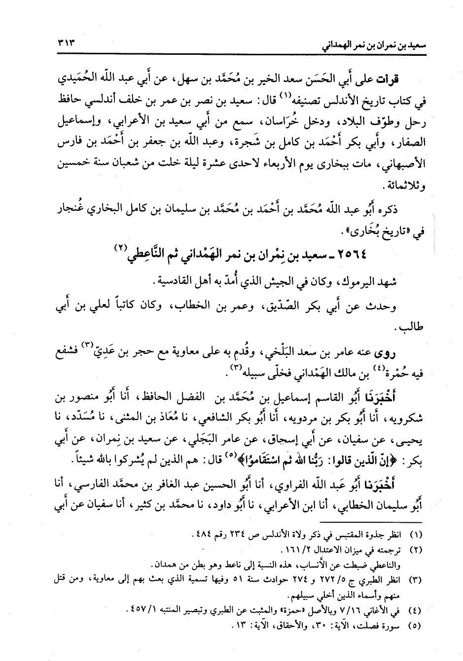 2564 - سعيد بن نمران بن نمر الهمداني ثم الناعطي (2) شهد اليرموك وكان في الجيش الذي أمد به أهل القادسية وحدث عن أبي بكر الصديق وعمر بن الخطاب وكان كاتبا لعلي بن أبي طالب روى عنه عامر بن سعد البلخي وقدم به على معاوية مع حجر بن عدي (3) فشفع فيه حمرة (4) بن مالك الهمداني فخلى سبيله (3) أخبرنا أبو القاسم إسماعيل بن محمد بن الفضل الحافظ أنا أبو منصور بن شكرويه أنا أبو بكر بن مردويه أنا أبو بكر الشافعي نا معاذ بن المثنى نا مسدد نا يحيى عن سفيان عن أبي إسحاق عن عامر البجلي عن سعيد بن نمران عن أبي بكر " إن الذين قالوا ربنا الله ثم استقاموا (5) " قال هم الذين لم يشركوا بالله شيئا أخبرنا أبو عبد الله الفراوي أنا أبو الحسين عبد الغافر بن محمد الفارسي أنا أبو سليمان الخطابي أنا ابن الأعرابي نا أبو داود نا محمد بن كثير أنا سفيان عن أبي