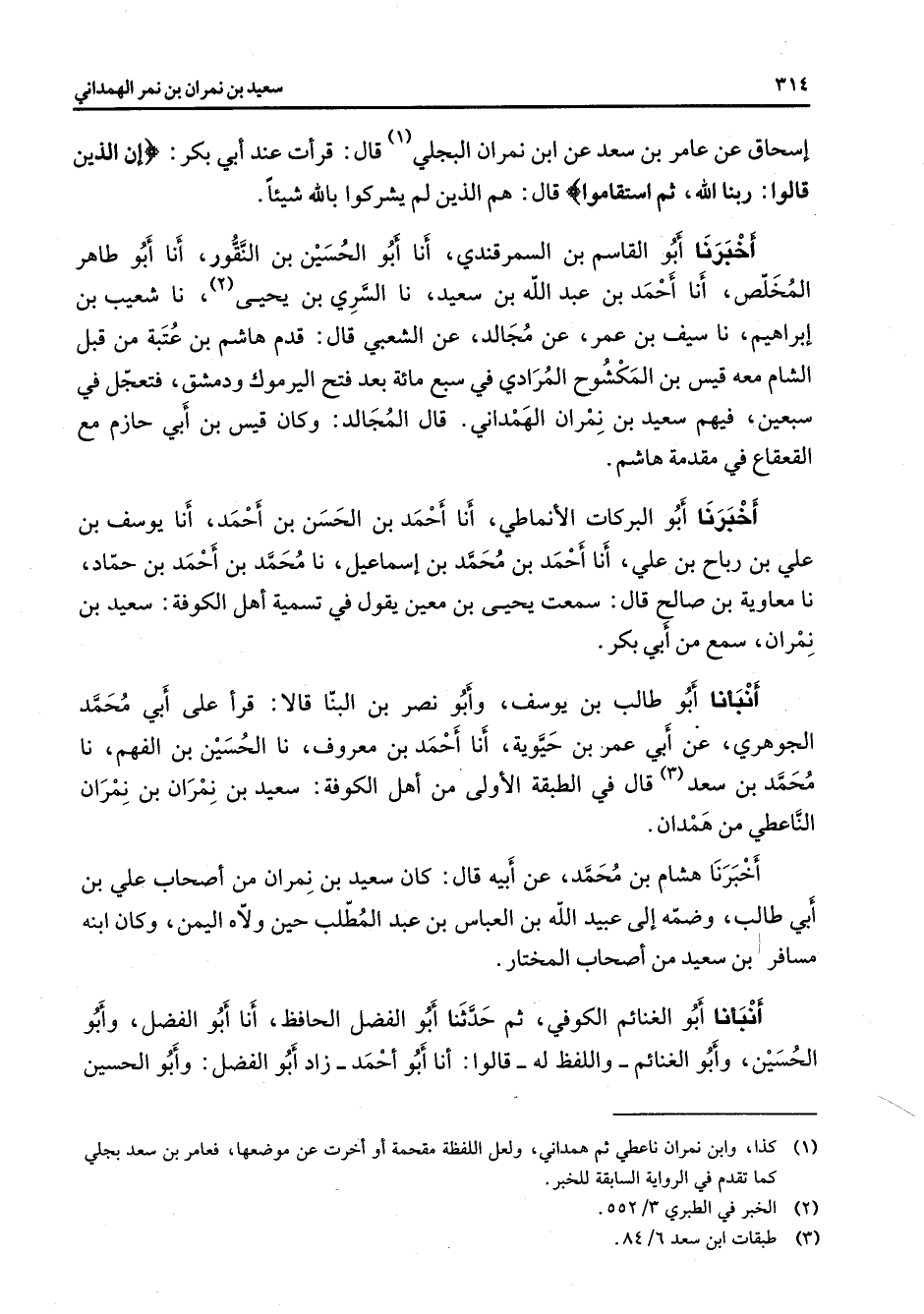 إسحاق عن عامر بن سعد عن ابن نمران البجلي (1) قال قرأت عند أبي بكر " إن الذين قالوا ربنا الله ثم استقاموا " قال هم الذين لم يشركوا بالله شيئا أخبرنا أبو القاسم بن السمرقندي أنا أبو الحسين بن النقور أنا أبو طاهر المخلص أنا أحمد بن عبد الله بن سعيد نا السري بن يحيى (2) نا شعيب بن إبراهيم نا سيف بن عمر عن مجالد عن الشعبي قال قدم هاشم بن عتبة من قبل الشام معه قيس بن المكشوح المرادي في سبع مائة بعد فتح اليرموك ودمشق فتعجل في سبعين فيهم سعيد بن نمران الهمداني قال المجالد وكان قيس بن أبي حازم مع القعقاع في مقدمة هاشم أخبرنا أبو البركات الأنماطي أنا أحمد بن الحسن بن أحمد أنا يوسف بن علي بن رباح بن علي أنا أحمد بن محمد بن إسماعيل نا محمد بن أحمد بن حماد نا معاوية بن صالح قال سمعت يحيى بن معين يقول في تسمية أهل الكوفة سعيد بن نمران سمع من أبي بكر أنبأنا أبو طالب بن يوسف وأبو نصر بن البنا قالا قرأ على أبي محمد الجوهري عن أبي عمر بن حيوية أنا أحمد بن معروف نا الحسين بن الفهم نا محمد بن سعد (3) قال في الطبقة الأولى من أهل الكوفة سعيد بن نمران بن نمران الناعطي من همدان أخبرنا هشام بن محمد عن أبيه قال كان سعيد بن نمران من أصحاب علي بن أبي طالب وضمه إلى عبيد الله بن العباس بن عبد المطلب حين ولاه اليمن وكان ابنه مسافر بن سعيد من أصحاب المختار أنبأنا أبو الغنائم الكوفي ثم حدثنا أبو الفضل الحافظ أنا أبو الفضل وأبو الحسين وأبو الغنائم واللفظ له قالوا أنا أبو أحمد زاد أبو الفضل وأبو الحسين