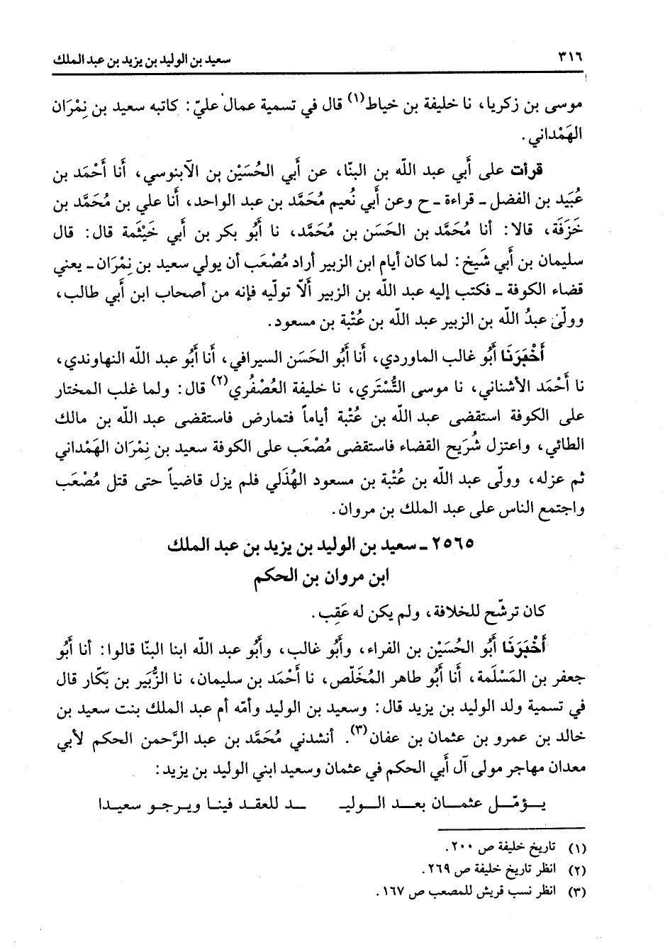 موسى بن زكريا نا خليفة بن خياط (1) قال في تسمية عمال علي كاتبه سعيد بن نمران الهمداني قرأت على أبي عبد الله بن البنا عن أبي الحسين بن الآبنوسي أنا أحمد بن عبيد بن الفضل قراءة وعن أبي نعيم محمد بن عبد الواحد أنا علي بن محمد بن خزفة قالا أنا محمد بن الحسن بن محمد نا أبو بكر بن أبي خيثمة قال قال سليمان بن أبي شيخ لما كان أيام ابن الزبير أراد مصعب أن يولي سعيد بن نمران يعني قضاء الكوفة فكتب إليه عبد الله بن الزبير ألا توليه فإنه من أصحاب ابن أبي طالب وولى عبد الله بن الزبير عبد الله بن عتبة بن مسعود أخبرنا أبو غالب الماوردي أنا أبو الحسن السيرافي أنا أبو عبد الله النهاوندي نا أحمد الأشناني نا موسى التستري نا خليفة العصفري (2) قال ولما غلب المختار على الكوفة استقضى عبد الله بن عتبة أياما فتمارض فاستقضى عبد الله بن مالك الطائي واعتزل شريح القضاء فاستقضى مصعب على الكوفة سعيد بن نمران الهمداني ثم عزله وولى عبد الله بن عتبة بن مسعود الهذلي فلم يزل قاضيا حتى قتل مصعب واجتمع الناس على عبد الملك بن مروان 2565 سعيد بن الوليد بن يزيد بن عبد الملك بن مروان بن الحكم كان ترشح للخلافة ولم يكن له عقب أخبرنا أبو الحسين بن الفراء وأبو غالب وأبو عبد الله ابنا البنا قالوا أنا أبو جعفر بن المسلمة أنا أبو طاهر المخلص نا أحمد بن سليمان نا الزبير بن بكار قال في تسمية ولد الوليد بن يزيد قال وسعيد بن الوليد وأمه أم عبد الملك بنت سعيد بن خالد بن عمرو بن عثمان بن عفان (3) أنشدني محمد بن عبد الرحمن الحكم لأبي معدان مهاجر مولى آل أبي الحكم في عثمان وسعيد ابني الوليد بن يزيد يؤمل عثمان بعد الولي * د للعقد فينا ويرجو سعيدا