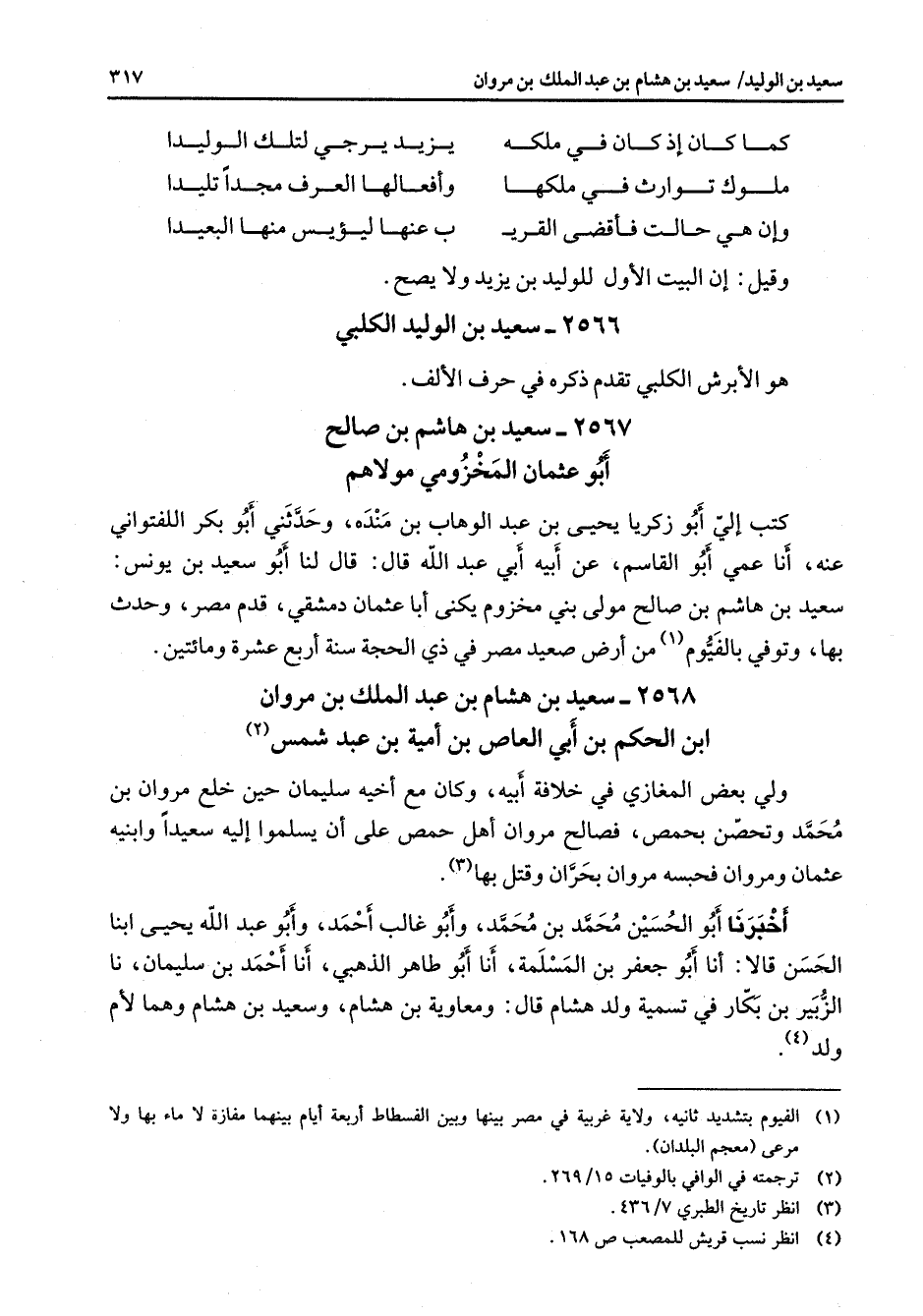 2568 - سعيد بن هشام بن عبد الملك بن مروان ابن الحكم بن أبي العاص بن أمية بن عبد شمس (2) ولي بعض المغازي في خلافة أبيه وكان مع أخيه سليمان حين خلع مروان بن محمد وتحصن بحمص فصالح مروان أهل حمص على أن يسلموا إليه سعيدا وابنيه عثمان ومروان فحبسه مروان بحران وقتل بها (3) أخبرنا أبو الحسين محمد بن محمد وأبو غالب أحمد وأبو عبد الله يحيى ابنا الحسن قالا أنا أبو جعفر بن المسلمة أنا أبو طاهر الذهبي أنا أحمد بن سليمان نا الزبير بن بكار في تسمية ولد هشام قال ومعاوية بن هشام وسعيد بن هشام وهما لأم ولد (4)