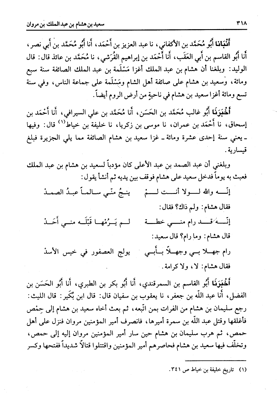 أنبأنا أبو محمد بن الأكفاني نا عبد العزيز بن أحمد أنا أبو محمد بن أبي نصر أنا أبو القاسم بن أبي العقب أنا أنا أحمد بن إبراهيم القرشي نا محمد بن عائذ قال قال الوليد وبلغنا أن هشام بن عبد الملك أغزا مسلمة بن عبد الملك الصائفة سنة سبع ومائة وسعيد بن هشام على صائفة أهل الشام ومسلمة على جماعة الناس وفي سنة تسع ومائة أغزا سعيد بن هشام في ناحية من أرض الروم أيضا أخبرنا أبو غالب محمد بن الحسن أنا محمد بن علي السيرافي أنا أحمد بن إسحاق نا أحمد بن عمران نا موسى بن زكريا نا خليفة بن خياط (1) قال وفيها يعني سنة إحدى عشرة ومائة غزا سعيد بن هشام الصائفة مما يلي الجزيرة فبلغ قيسارية وبلغني أن عبد الصمد بن عبد الأعلى كان مؤدبا لسعيد بن هشام بن عبد الملك فعبث به يوما فدخل سعيد على هشام فوقف بين يديه ثم أنشأ يقول إنه والله لولا أنت لم * ينج مني سالما عبد الصمد * فقال هشام ولم ذاك فقال إنه قد رام مني خطة * لم يرمها قبله مني أحد * قال هشام وما رام قال سعيد رام جهلا بي وجهلا بأبي * ويولج العصفور في خيس الأسد * فقال هشام لا ولا كرامة أخبرنا أبو القاسم بن السمرقندي أنا أبو بكر بن الطبري أنا أبو الحسن بن الفضل أنا عبد الله بن جعفر نا يعقوب بن سفيان قال قال ابن بكير قال الليث رجع سليمان بن هشام من الفرات بمن اتبعه ثم بعث أخاه سعيد بن هشام إلى حمص فأغلقها وقتل عبد الله بن سمرة أميرها فانصرف أمير المؤمنين مروان فنزل على أهل حمص ثم هرب سليمان بن هشام حين سار أمير المؤمنين مروان إليه إلى حمص وتخلف فيها سعيد بن هشام حين سار أمير المؤمنين مروان إليه إلى حمص وتخلف فيها سعيد بن هشام فحاصرهم أمير المؤمنين واقتتلوا قتالا شديدا ففتحها وكسر