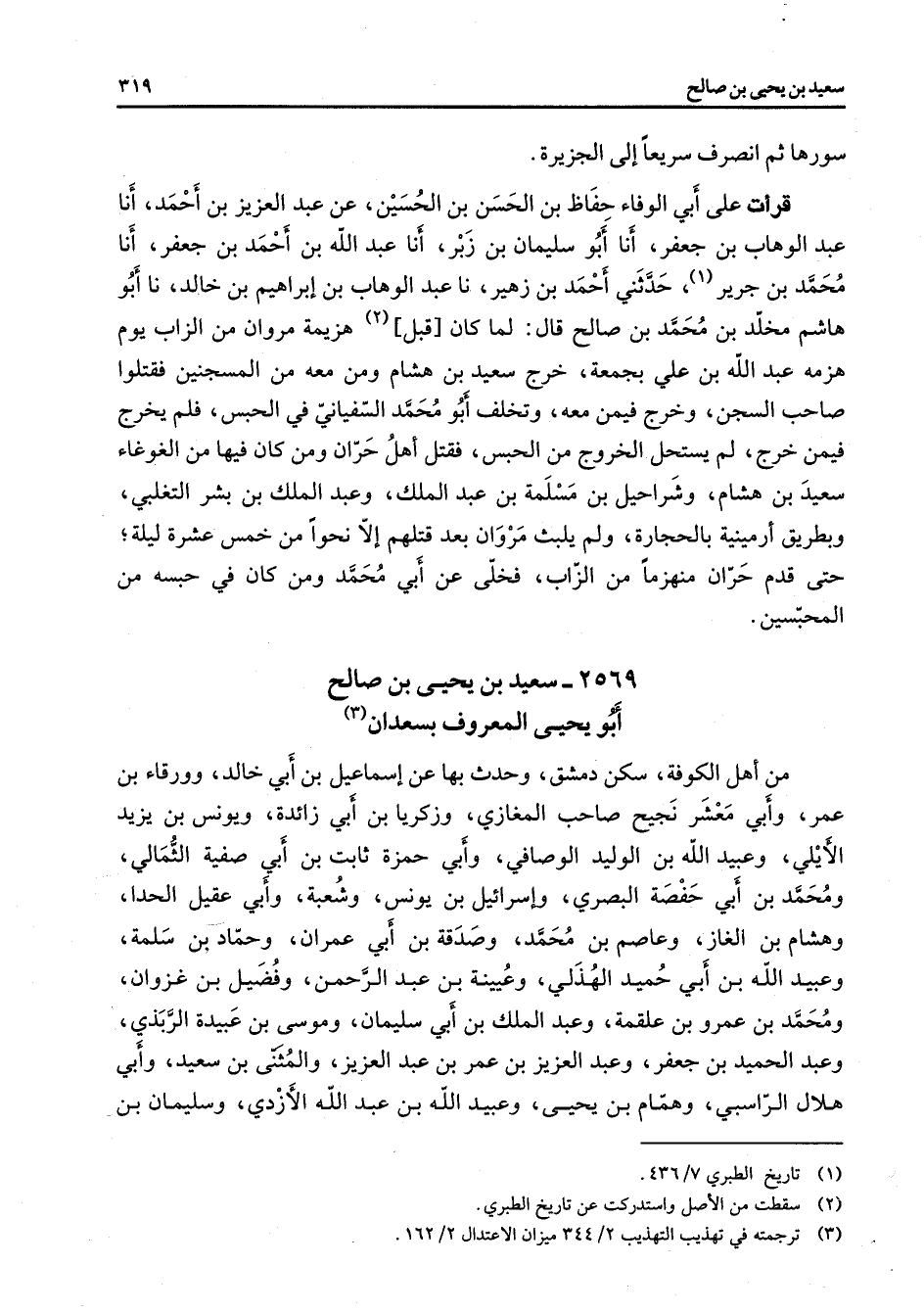 سورها ثم انصرف سريعا إلى الجزيرة قرأت على أبي الوفاء حفاظ بن الحسن بن الحسين عن عبد العزيز بن أحمد أنا عبد الوهاب بن جعفر أنا أبو سليمان بن زبرأنا عبد الله بن أحمد بن جعفر أنا محمد بن جرير (1) حدثني أحمد بن زهير نا عبد الوهاب بن إبراهيم بن خالد نا أبو هاشم مخلد بن محمد بن صالح قال لما كان قبل (2) هزيمة مروان من الزاب يوم هزمه عبد الله بن علي بجمعة خرج سعيد بن هشام ومن معه من المسجنين فقتلوا صاحب السجن وخرج فيمن معه وتخلف أبو محمد السفياني في الحبس فلم يخرج فيمن خرج لم يستحل الخروج من الحبس فقتل أهل حران ومن كان فيها من الغوغاء سعيد بن هشام وشراحيل بن مسلمة بن عبد الملك وعبد الملك بن بشر التغلبي وبطريق أرمينة بالحجارة ولم يلبث مروان بعد قتلهم إلا نحوا من خمس عشرة ليلة حتى قدم حران منهزما من الزاب فخلى عن أبي محمد ومن كان في حبسه من المحبسين