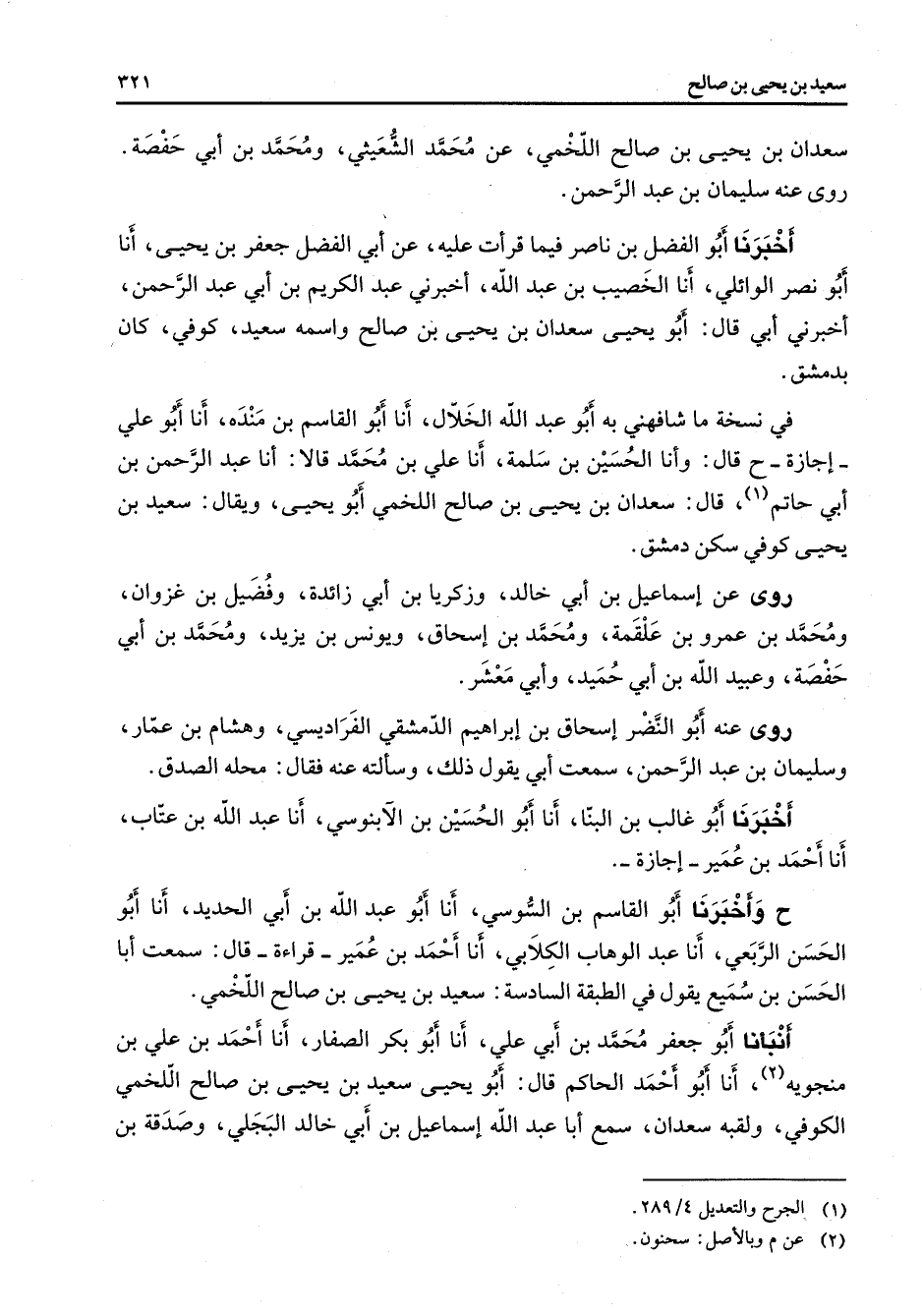 سعدان بن يحيى بن صالح اللخمي عن محمد الشعيثي ومحمد بن أبي حفصة روى عنه سليمان بن عبد الرحمن أخبرنا أبو الفضل بن ناصر فيما قرأت عليه عن أبي الفضل جعفر بن يحيى أنا أبو نصر الوائلي أنا الخصيب بن عبد الله أخبرني عبد الكريم بن أبي عبد الرحمن أخبرني أبي قال أبو يحيى سعدان بن يحيى بن صالح واسمه سعيد كوفي كان بدمشق في نسخة ما شافهني به أبو عبد الله الخلال أنا أبو القاسم بن منده أنا أبو علي إجازة قال وأنا الحسين بن سلمة أنا علي بن محمد قالا أنا عبد الرحمن بن أبي حاتم (1) قال سعدان بن يحيى بن صالح اللخمي أبو يحيى ويقال سعيد بن يحيى كوفي سكن دمشق روى عن إسماعيل بن أبي خالد وزكريا بن أبي زائدة وفضيل بن غزوان ومحمد بن عمرو بن علقمة ومحمد بن إسحاق ويونس بن يزيد ومحمد بن أبي حفصة وعبيد الله بن أبي حميد وأبي معشر روى عنه أبو النضر إسحاق بن إبراهيم الدمشقي الفراديسي وهشام بن عمار وسليمان بن عبد الرحمن سمعت أبي يقول ذلك وسألته عنه فقال محله الصدق أخبرنا أبو غالب بن البنا أنا أبو الحسين بن الابنوسي أنا عبد الله بن عتاب أنا أحمد بن عمير إجازة ح وأخبرنا أبو القاسم بن السوسي أنا أبو عبد الله بن أبي الحديد أنا أبو الحسن الربعي أنا عبد الوهاب الكلابي أنا أحمد بن عمير قراءة قال سمعت أبا الحسن بن سميع يقول في الطبقة السادسة سعيد بن يحيى بن صالح اللخمي أنبأنا أبو جعفر محمد بن أبي علي أنا أبو بكر الصفار أنا أحمد بن علي بن منجويه (2) أنا أبو أحمدالحاكم قال أبو يحيى سعيد بن يحيى بن صالح اللخمي الكوفي ولقبه سعدان سمع أبا عبد الله إسماعيل بن أبي خالد البجلي وصدقة بن