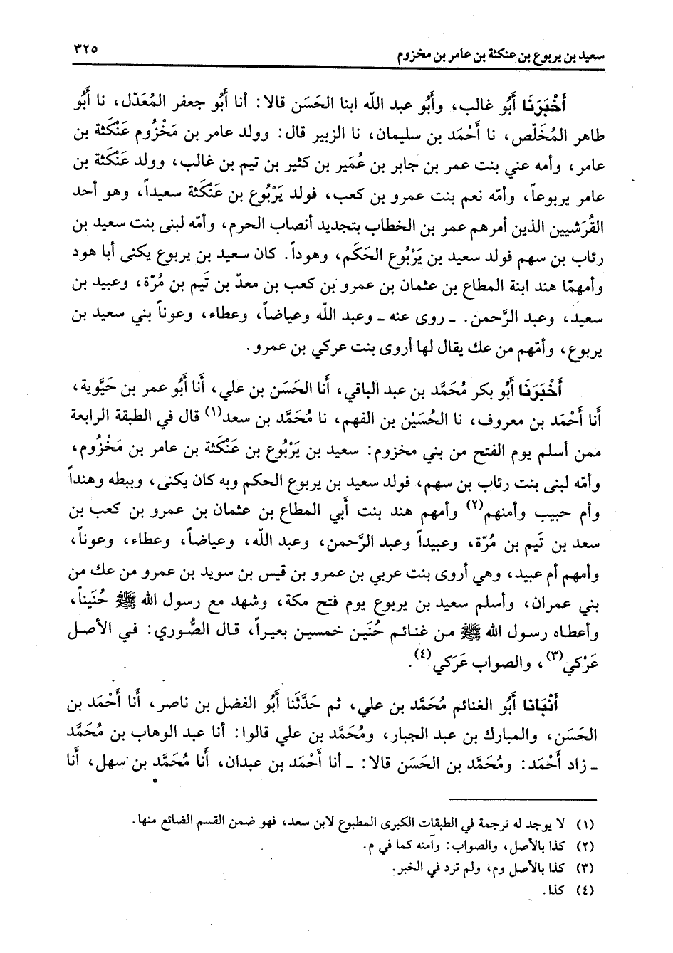 أخبرنا أبو غالب وأبو عبد الله ابنا الحسن قالا أنا أبو جعفر المعدل نا أبو طاهر المخلص نا أحمد بن سليمان نا الزبير قال وولد عامر بن مخزوم عنكثة بن عامر وأمه عني بنت عمر بن جابر بن عمير بن كثير بن تيم بن غالب وولد عنكثة بن عامر يربوعا وأمه نعم بنت عمرو بن كعب فولد يربوع بن عنكثة سعيدا وهو أحد القرشيين الذين أمرهم عمر بن الخطاب بتجديد أنصاب الحرم وأمه لبنى بنت سعيد بن رئاب بن سهم فولد سعيد بن يروع الحكم وهودا كان سعيد بن يربوع يكنى أبا هود وأمهما هند ابنة المطاع بن عثمان بن عمرو بن كعب بن معد بن تيم بن مرة وعبيد بن سعيد وعبد الرحمن روى عنه وعبد الله وعياضا وعطاء وعونا بني سعيد بن يربوع وأمهم من عك يقال لها أروى بنت عركي بن عمرو أخبرنا أبو بكر محمد بن عبد الباقي أنا الحسن بن علي أنا أبو عمر بن حيوية أنا أحمد بن معروف نا الحسين بن الفهم نا محمد بن سعد (1) قال في الطبقة الرابعة ممن أسلم يوم الفتح من بني مخزوم سعيد بن يربوع بن عنكثة بن عامر بن مخزوم وأمه لبنى بنت رئاب بن سهم فولد سعيد بن يربوع الحكم وبه كان يكنى وببطه وهندا وأم حبيب وأمنهم (2) وأمهم هند بنت أبي المطاع بن عثمان بن عمرو بن كعب بن سعد بن تيم بن مرة وعبيدا وعبد الرحمن وعبد الله وعياضا وعطاء وعونا وأمهم أم عبيد وهي أروى بنت عربي بن عمرو بن قيس بن سويد بن عمرو من عك من بني عمران وأسلم سعيد بن يربوع يوم فتح مكة وشهد مع رسول الله (صلى الله عليه وسلم) في حنينا وأعطاه رسول الله (صلى الله عليه وسلم) من غنائم حنين خمسين بعيرا قال الصوري في الأصل عركي (3) والصواب عركي (4) أنبأنا أبو الغنائم محمد بن علي ثم حدثنا أبو الفضل بن ناصر أنا أحمد بن الحسن والمبارك بن عبد الجبار ومحمد بن علي قالوا أنا عبد الوهاب بن محمد زاد أحمد ومحمد بن الحسن قالا أنا أحمد بن عبدان أنا محمد بن سهل أنا