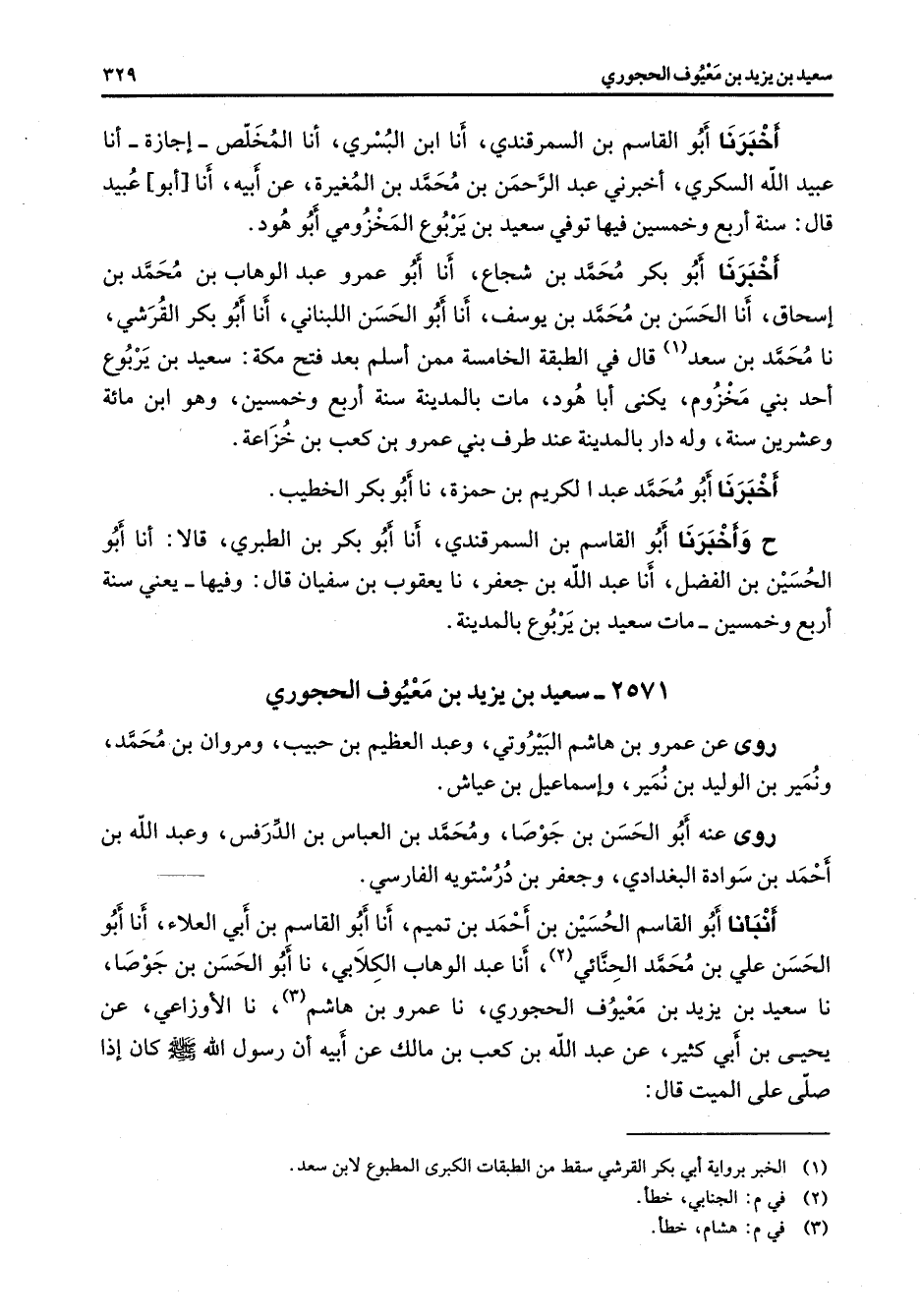 2571 - سعيد بن يزيد بن معيوف الحجوري روى عن عمرو بن هاشم البيروتي وعبد العظيم بن حبيب ومروان بن محمد ونمير بن الوليد بن نمير وإسماعيل بن عياش روى عنه أبو الحسن بن جوصا ومحمد بن العباس بن الدرفس وعبد الله بن أحمد بن سوادة البغدادي وجعفر بن درستويه الفارسي أنبأنا أبو القاسم الحسين بن أحمد بن تميم أنا أبو القاسم بن أبي العلاء أنا أبو الحسن علي بن محمد الحنائي (2) أنا عبد الوهاب الكلابي نا أبو الحسن بن جوصا نا سعيد بن يزيد بن معيوف الحجوري نا عمرو بن هاشم (3) نا الأوزاعي عن يحيى بن أبي كثير عن عبد الله بن كعب بن مالك عن أبيه أن رسول الله (صلى الله عليه وسلم) كان إذا صلى على الميت قال