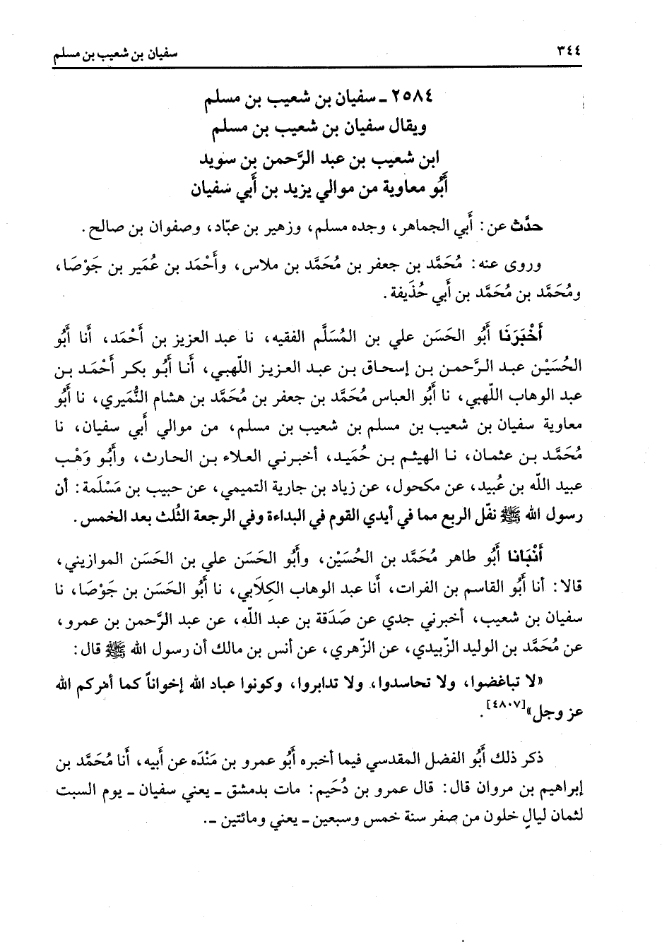 2584 - سفيان بن شعيب بن مسلم ويقال سفيان بن شعيب بن مسلم ابن شعيب بن عبد الرحمن بن سويد أبو معاوية من موالي يزيد بن أبي سفيان حدث عن أبي الجماهر وجده مسلم وزهير بن عباد وصفوان بن صالح وروى عنه محمد بن جعفر بن محمد بن ملاس وأحمد بن عمير بن جوصا ومحمد بن محمد بن أبي حذيفة أخبرنا أبو الحسن علي بن المسلم الفقيه نا عبد العزيز بن أحمد أنا أبو الحسين عبد الرحمن بن إسحاق بن عبد العزيز اللهبي أنا أبو بكر أحمد بن عبد الوهاب اللهبي نا أبو العباس محمد بن جعفر بن محمد بن هشام النميري نا أبو معاوية سفيان بن شعيب بن مسلم بن شعيب بن مسلم من موالي أبي سفيان نا محمد بن عثمان نا الهيثم بن حميد أخبرني العلاء بن الحارث وأبو وهب عبيد الله بن عبيد عن مكحول عن زياد بن جارية التميمي عن حبيب بن مسلمة أن رسول الله (صلى الله عليه وسلم) نقل الربع مما في أيدي القوم في البداءة وفي الرجعة الثلث بعد الخمس أنبأنا أبو طاهر محمد بن الحسين وأبو الحسن علي بن الحسن الموازيني قالا أنا أبو القاسم بن الفرات أنا عبد الوهاب الكلابي نا أبو الحسين بن جوصا نا سفيان بن شعيب أخبرني جدي عن صدقة بن عبد الله عن عبد الرحمن بن عمرو عن محمد بن الوليد الزبيدي عن الزهري عن أنس بن مالك أن رسول الله (صلى الله عليه وسلم) قال لا تباغضوا ولا تحاسدوا ولا تدابروا وكونوا عباد الله إخوانا كما أمركم الله عز وجل ذكر ذلك أبو الفضل المقدسي فيما أخبره أبو عمرو بن منده عن أبيه أنا محمد بن إبراهيم بن مروان قال قال عمرو بن دحيم مات بدمشق يعني سفيان يوم السبت لثمان ليل خلون من صفر سنة خمس وسبعين يعني ومائتين