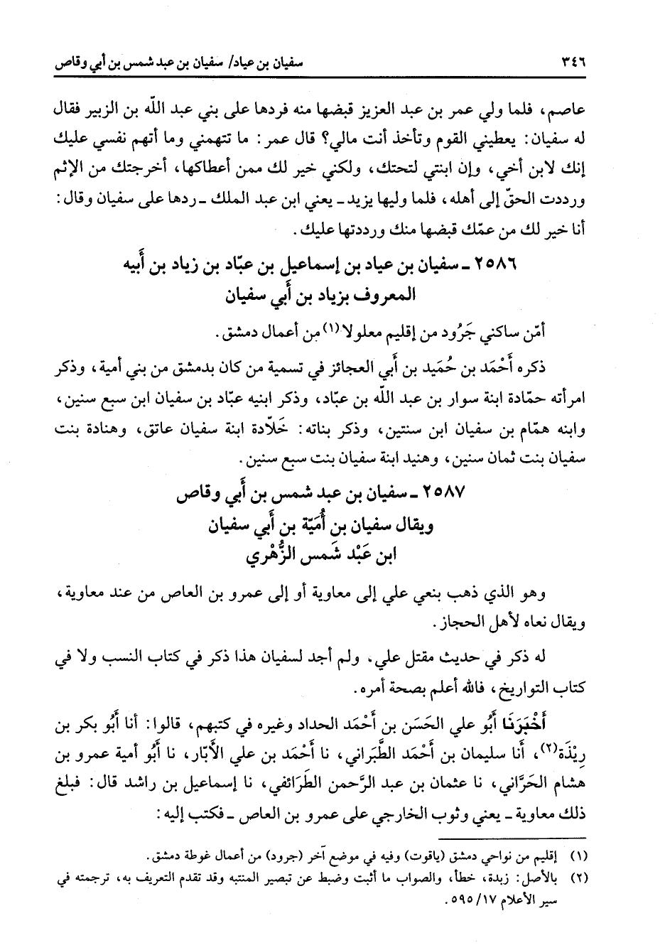 2586 - سفيان بن عياد بن إسماعيل بن عباد بن زياد بن أبيه المعروف بزياد بن أبي سفيان أمن ساكني جرود من إقليم معلولا (1) من أعمال دمشق ذكره أحمد بن حميد بن أبي العجائز في تسمية من كان بدمشق من بني أمية وذكر امرأته حمادة ابنة سوار بن عبد الله بن عباد وذكر ابنيه عباد بن سفيان ابن سبع سنين وابنه همام بن سفيان ابن سنتين وذكر بناته خلادة ابنة سفيان عاتق وهنادة بنت سفيان بنت ثمان سنين وهنيآد ابنة سفيان بنت سبع سنين
