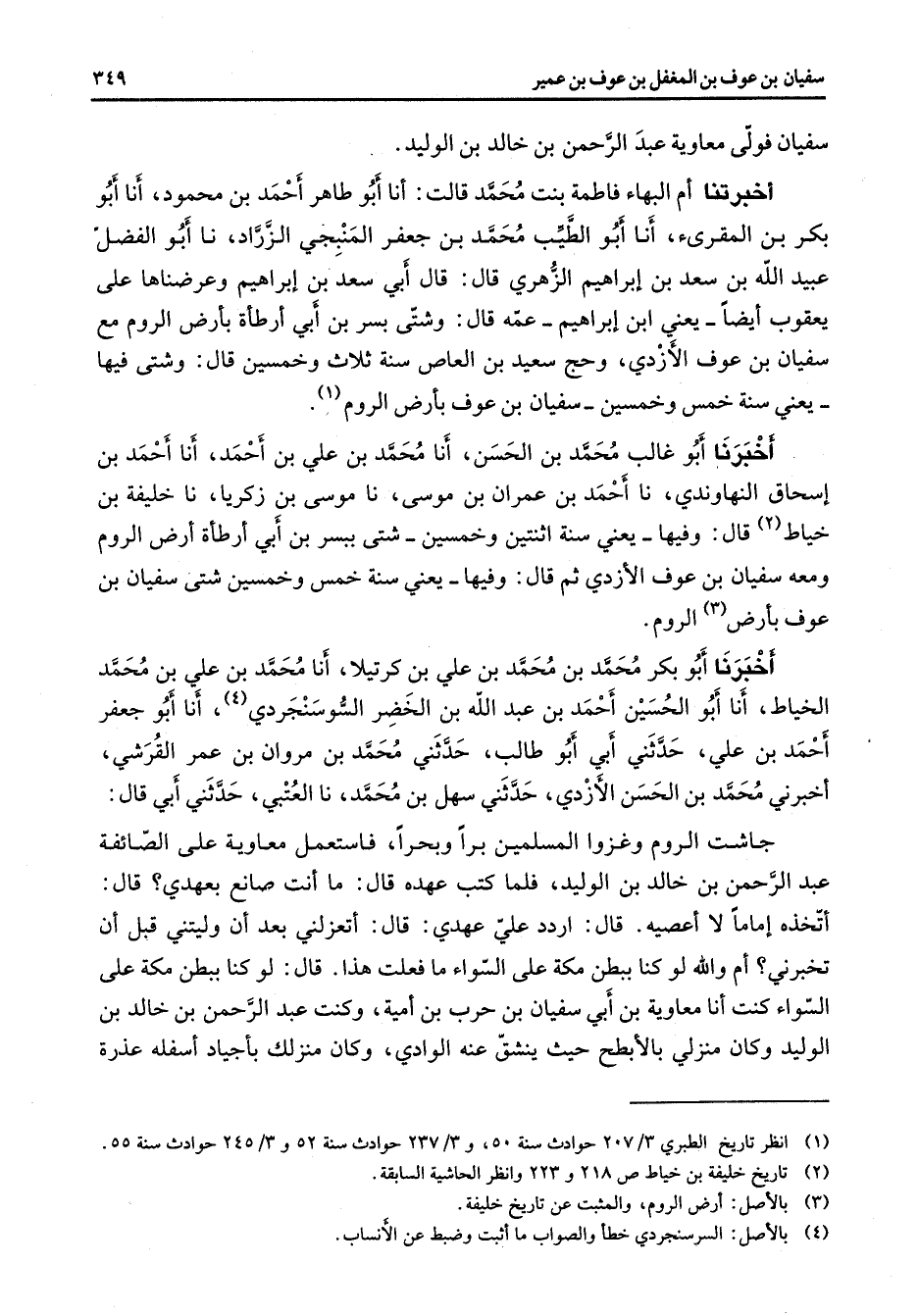 سفيان فولى معاوية عبد الرحمن بن خالد بن الوليد أخبرتنا أم البهاء فاطمة بنت محمد قالت أنا أبو طاهر أحمد بن محمود أنا أبو بكر بن المقرئ أنا أبو الطيب محمد بن جعفر المنبجي الزراد نا أبو الفضل عبيد الله بن سعد بن إبراهيم الزهري قال قال أبي سعد بن إبراهيم وعرضناها على يعقوب أيضا يعني ابن إبراهيم عمه قال وشتى بسر بن أبي أرطأة بأرض الروم مع سفيان بن عوف الأزدي وحج سعيد بن العاص سنة ثلاث وخسمين قال وشتى فيها يعني سنة خمس وخمسين سفيان بن عوف بأرض الروم (1) أخبرنا أبو غالب محمد بن الحسن أنا محمد بن علي بن أحمد أنا أحمد بن إسحاق النهاوندي نا أحمد بن عمران بن موسى نا موسى بن زكريا نا خليفة بن خياط (2) قال وفيها يعني سنة اثنتين وخمسين شتى ببسر بن أبي أرطأة أرض الروم ومعه سفيان بن عوف الأزدي ثم قال وفيها يعني سنة خمس وخمسين شتى سفيان بن عوف بأرض (3) الروم أخبرنا أبو بكر محمد بن محمد بن علي بن كرتيلا أنا محمد بن علي بن محمد الخياط أنا أبو الحسين أحمد بن عبد الله بن الخضر السوسنجردي (4) أنا أبو جعفر أحمد بن علي حدثني أبي أبو طالب حدثني محمد بن مروان بن عمر القرشي أخبرني محمد بن الحسن الأزدي حدثني سهل بن محمد نا العتبي حدثني أبي قال جاشت الروم وغزوا المسلمين برا وبحرا فاستعمل معاوية على الصائفة عبد الرحمن بن خالد بن الوليد فلما كتب عهده قال ما أنت صانع بعهدي قال أتخذه أماما لا أعصيه قال اردد علي عهدي قال أتعزلني بعد أن وليتني قبل أن تخبرني أم والله لو كنا ببطن مكة على السواء ما فعلت هذا قال لو كنا ببطن مكة على السواء كنت أنا معاوية بن أبي سفيان بن حرب بن أمية وكنت عبد الرحمن بن خالد بن الوليد وكان منزلي بالأبطح حيث ينشق عنه الوادي وكان منزلك بأجياد أسفله عذرة