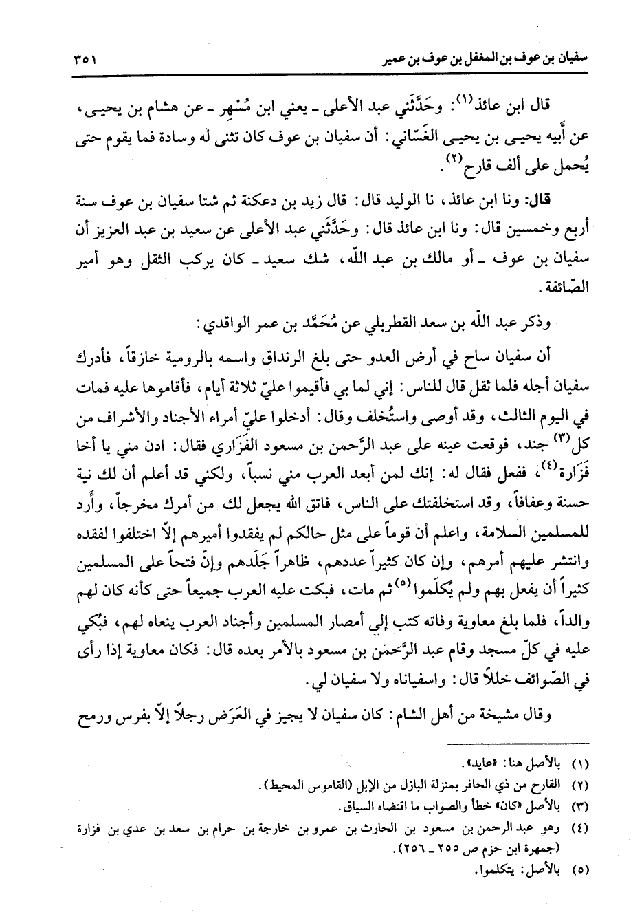 قال ابن عائذ (1) وحدثني عبد الأعلى يعني ابن مسهر عن هشام بن يحيى عن أبيه يحيى بن يحيى الغساني أن سفيان بن عوف كان تثنى له وسادة فما يقوم حتى يحمل على ألف قارح (2) قال ونا ابن عائذ نا الوليد قال قال زيد بن دعكنة ثم شتا سفيان بن عوف سنة أربع وخمسين قال ونا ابن عائذ قال وحدثني عبد الأعلى عن سعيد بن عبد العزيز أن سفيان بن عوف أو مالك بن عبد الله شك سعيد كان يركب الثقل وهو أمير الصائفة وذكرعبد الله بن سعد القطربلي عن محمد بن عمر الواقدي أن سفيان ساح في أرض العدو حتى بلغ الرنداق واسمه بالرومية خازقا فأدرك سفيان أجله فلما ثقل قال للناس إني لما بي فأقيموا علي ثلاثة أيام فأقاموها عليه فمات في اليوم الثالث وقد أوصى واستخلف وقال أدخلوا علي أمراء الأجناد والأشراف من كل (3) جند فوقعت عينه على عبد الرحمن بن مسعود الفزاري فقال ادن مني يا أخا فزارة (4) ففعل فقال له إنك لمن أبعد العرب مني نسبا ولكني قد أعلم أن لك نية حسنة وعفافا وقد استخلفتك على الناس فاتق الله يجعل لك من أمرك مخرجا وأرد للمسلمين السلامة واعلم أن قوما على مثل حالكم لم يفقدوا أميرهم إلا اختلفوا لفقده وانتشر عليهم أمرهم وإن كان كثيرا عددهم ظاهرا جلدهم وإن فتحا على المسلمين كثيرا أن يفعل لهم ولم يكلموا (5) ثم مات فبكت عليه العرب جميعا حتى كأنه كان لهم والدا فلما بلغ معاوية وفاته كتب إلى أمصار المسلمين وأجناد العرب ينعاه لهم فبكي عليه في كل مسجد وقال عبد الرحمن بن مسعود بالأمر بعده قال فكان معاوية إذا رأى في الصوائف خللا قال واسفياناه ولا سفيان لي وقال مشيخة من أهل الشام كان سفيان لا يجيز في العرض رجلا إلا بفرس ورمح