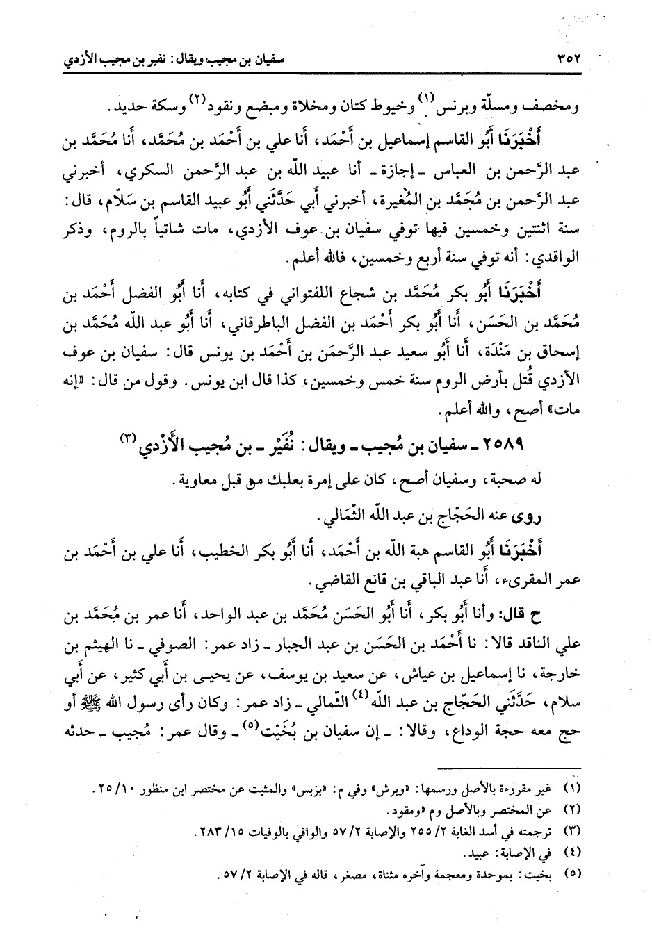 2589 - سفيان بن مجيب ويقال نفير بن مجيب الأزدي (3) له صحبة وسفيان أصح كان على إمرة بعلبك من قبل معاوية روى عنه الحجاج بن عبد الله الثمالي أخبرنا أبو القاسم هبة الله بن أحمد أنا أبو بكر الخطيب أنا علي بن أحمد بن عمر المقرئ أنا عبد الباقي بن قانع القاضي ح قال وأنا أبو بكر أنا أبو الحسن محمد بن عبد الواحد أنا عمر بن محمد بن على الناقد قالا نا أحمد بن الحسن بن عبد الجبار زاد عمر الصوفي نا الهيثم بن خارجة نا إسماعيل بن عياش عن سعيد بن يوسف عن يحيى بن أبي كثير عن أبي سلام حدثني الحجاج بن عبد الله (4) الثمالي زاد عمر وكان رأى رسول الله (صلى الله عليه وسلم) أو حج معه حجة الوداع وقالا إن سفيان بن بخيت (5) وقال عمر مجيب حدثه