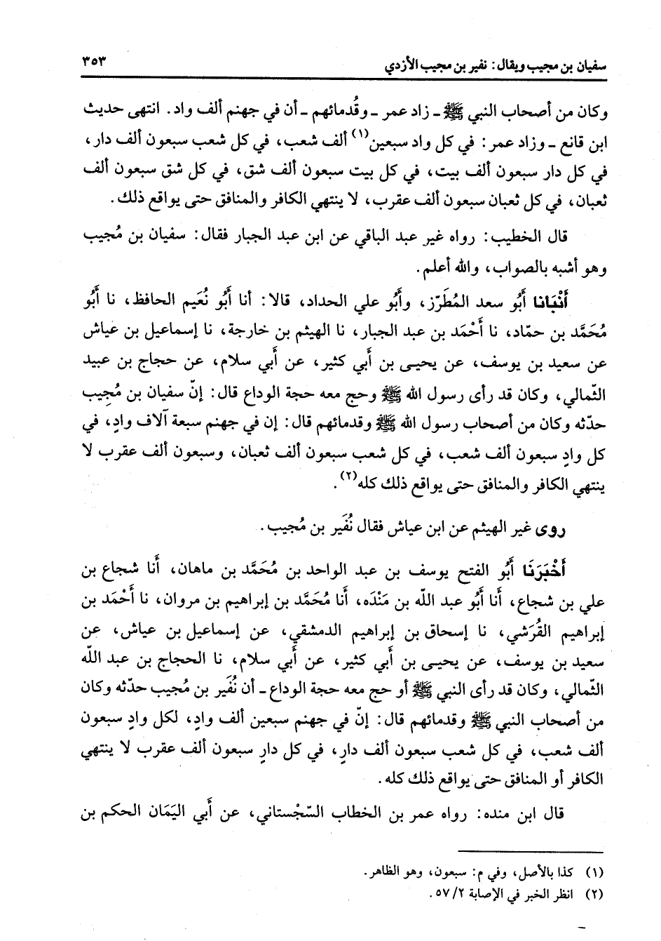 وكان من أصحاب النبي (صلى الله عليه وسلم) زاد عمر وقدمائهم أن في جهنم ألف واد انتهى حديث ابن قانع وزاد عمر في كل واد سبعين (1) ألف شعب في كل شعب سبعون ألف دار في كل دار سبعون ألف بيت سبعون ألف شق في كل شق سبعون ألف ثعبان في كل ثعبان سبعون ألف عقرب لا ينتهي الكافر والمنافق حتى يواقع ذلك قال الخطيب رواه غير عبد الباقي عن ابن عبد الجبار فقال سفيان بن مجيب وهو أشبه بالصواب والله أعلم أنبأنا أبو سعد المطرز وأبو علي الحداد قالا أنا أبو نعيم الحافظ نا أبو محمد بن حماد نا أحمد بن عبد الجبار نا الهيثم بن خارجة نا إسماعيل بن عياش عن سعيد بن يوسف عن يحيى بن أبي كثير عن أبي سلام عن حجاج بن عبيد الثمالي وكان قد رأى رسول الله وحج معه حجة الوداع قال إن سفيان بن مجيب حدثه وكان من أصحاب رسول الله (صلى الله عليه وسلم) وقدمائهم قال إن في جهنم سبعة آلاف واد في كل واد سبعون ألف شعب في كل شعب سبعون ألف ثعبان وسبعون ألف عقرب لا ينتهي الكافر والمنافق حتى يواقع ذلك كله (2) روى غير الهيثم عن ابن عياش فقال نفير بن مجيب أخبرنا أبو الفتح يوسف بن عبد الواحد بن محمد بن ماهان أنا شجاع بن علي بن شجاع أنا أبو عبد الله بن منده أنا محمد بن إبراهيم بن مروان نا أحمد بن إبراهيم القرشي نا إسحاق بن إبراهيم الدمشقي عن إسماعيل بن عياش عن سعيد بن يوسف عن يحيى بن أبي كثير عن أبي سلام نا الحجاج بن عبد الله الثمالي وكان قد رأى النبي (صلى الله عليه وسلم) أو حج معه حجة الوداع أن نفير بن مجيب حدثه وكان من أصحاب النبي (صلى الله عليه وسلم) وقدمائهم قال إن في جهنم سبعين ألف واد لكل واد سبعون ألف شعب في كل شعب سبعون ألف دار في كل دار سبعون ألف عقرب لا ينتهي الكافر أو المنافق حتى يواقع ذلك كله قال ابن منده رواه عمر بن الخطاب السجستاني عن أبي اليمان الحكم بن