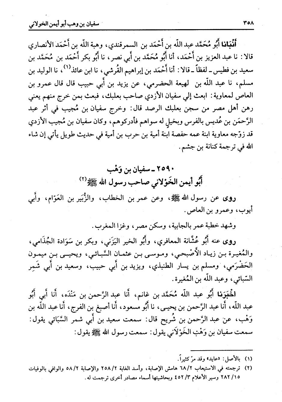2590 - سفيان بن وهب أبو أيمن الخولاني صاحب رسول الله (صلى الله عليه وسلم) (2) روى عن رسول الله (صلى الله عليه وسلم) وعن عمر بن الخطاب والزبير بن العوام وأبي أيوب وعمرو بن العاص وشهد خطبة عمر بالجابية وسكن مصر وغزا المغرب روى عنه أبو عشانة المعافري وأبو الخير اليزني وبكر بن سوادة الجذامي والمغيرة بن زياد الأصبحي وموسى بن عثمان السبائي ويحيى بن ميمون الحضرمي ومسلم بن يسار الطنبذي ويزيد بن أبي حبيب وسعيد بن أبي شمر السبائي وعبد الله بن المغيرة أخبرنا أبو عبد الله محمد بن غانم أنا عبد الرحمن بن منده أنا أبي أبو عبد الله أنا عبد الرحمن بن يحيى نا أبو مسعود أنا أصبغ بن الفرج أنا عبد الله بن وهب عن عبد الرحمن بن شريح قال سمعت سعيد بن أبي شمر السبائي يقول سمعت سفيان بن وهب الخولاني يقول سمعت رسول الله (صلى الله عليه وسلم) يقول