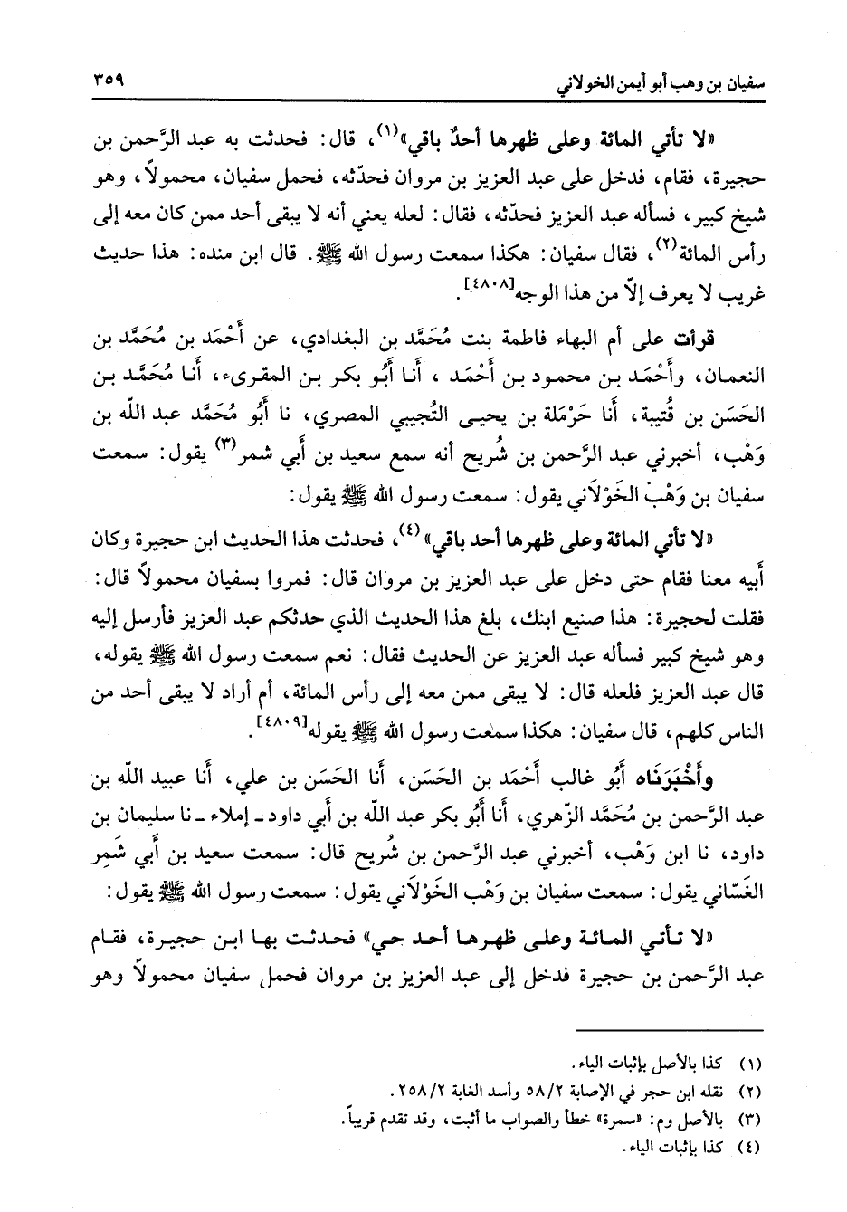 لا تأتي المائة وعلى ظهرها أحد باقي (1) قال فحدثت به عبد الرحمن بن حجيرة فقام فدخل على عبد العزيز بن مروان فحدثه فحمل سفيان محمولا وهو شيخ كبير فسأله عبد العزيز فحدثه فقال لعله يعني أنه لا يبقى أحد ممن كان معه إلى رأس المائة فقال سفيان هكذا سمعت رسول الله (صلى الله عليه وسلم) قال ابن منده هذا حديث غريب لا يعرف إلا من هذا الوجه قرأت على أم البهاء فاطمة بنت محمد بن الغدادي عن أحمد بن محمد بن النعمان وأحمد بن محمود بن أحمد أنا أبو بكر بن المقرئ أنا محمد بن الحسن بن قتيبة أنا حرملة بن يحيى التجيبي المصري نا أبو محمد عبد الله بن وهب أخبرني عبد الرحمن بن شريح أنه سمع سعيد بن أبي شمر (3) يقول سمعت سفيان بن وهب الخولاني يقول سمعت رسول الله (صلى الله عليه وسلم) يقول لا تأتي المائة وعلى ظهرها أحد باقي (4) فحدثت هذا الحديث ابن حجيرة وكان أبيه معنا فقام حتى دخل على عبد العزيز بن مروان قال فمروا بسفيان محمولا قال فقلت لحجيرة هذا صنيع ابنك بلغ هذا الحديث الذي حدثكم عبد العزيز فأرسل إليه وهو شيخ كبير فسأله عبد العزيز عن الحديث فقال نعم سمعت رسول الله (صلى الله عليه وسلم) يقوله قال عبد العزيز فلعله قال لا يبقى ممن معه إلى رأس المائة أم أراد لا يبقى أحد من الناس كلهم قال سفيان هكذا سمعت رسول الله (صلى الله عليه وسلم) يقوله وأخبرناه أبو غالب أحمد بن الحسن أنا الحسن بن علي أنا عبيد الله بن عبد الرحمن بن محمد الزهري أنا أبو بكر عبد الله بن أبي داود إملاء نا سليمان بن داود نا ابن وهب أخبرني عبد الرحمن بن شريح قال سمعت سعيد بن أبي شمر الغساني يقول سمعت سفيان بن وهب الخولاني يقول سمعت رسول الله (صلى الله عليه وسلم) يقول لا تأتي المائة وعلى ظهرها أحد حي فحدثت بها ابن حجيرة فقام عبد الرحمن بن حجيرة فدخل إلى عبد العزيز بن مروان فحمل سفيان محمولا وهو